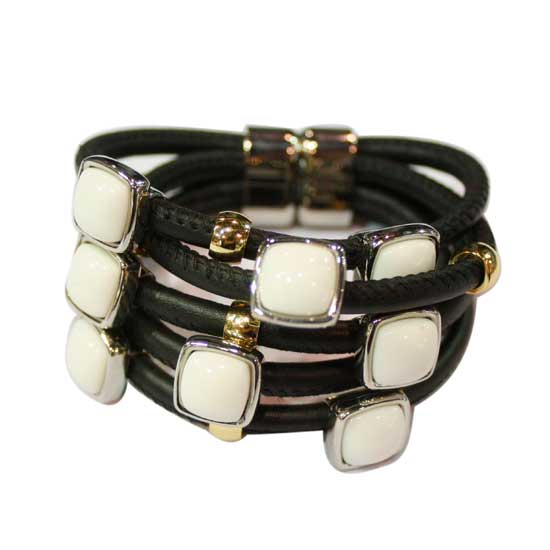 The photographed leather bracelet is decorated with polished white onyx stones that are chic and young. The genuine leather construction maintains a fashionable match with the stainless steel beads. This leather bracelet is a unisex accessory to wear with casual outfits.