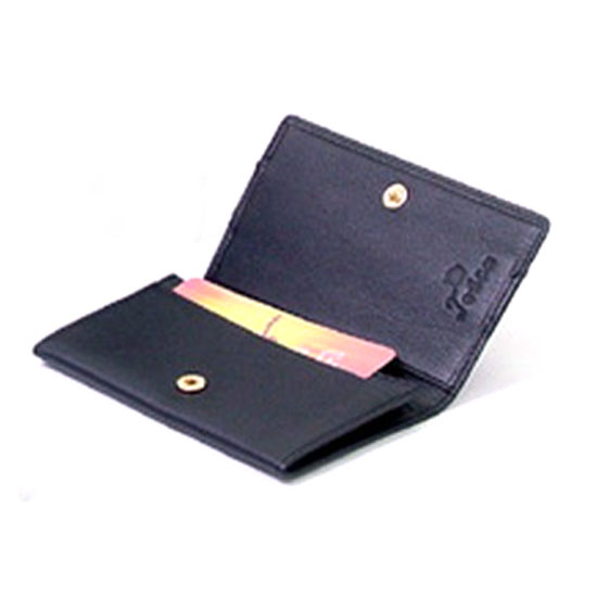 This card holder comes with a top-quality metal button closure sturdily attached onto the item. The company logo is engraved onto the surface of the inner part. This card holder is a nice choice for professional people.