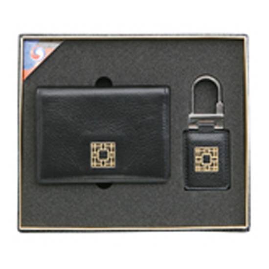 This is a gift set that the products are in black. The name card holder and key holder are made of leather that enchant businessmen. They have gold labels that make them look precious and luxurious.