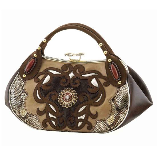 This premium handbag is designed with a scroll pattern surrounding a flower at the front.