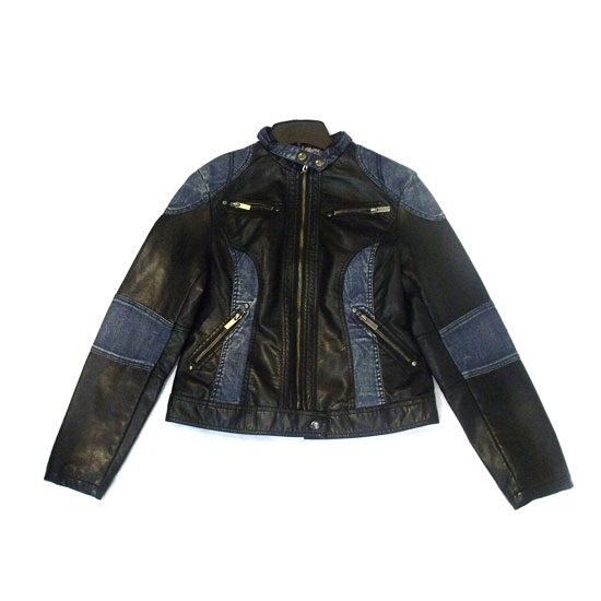 This is a ladies’ jacket that stands out front the rest with its cool and modern design. It is made of black leather with blue fabric accents. This jacket goes well with different kind of trousers for a trendy look.