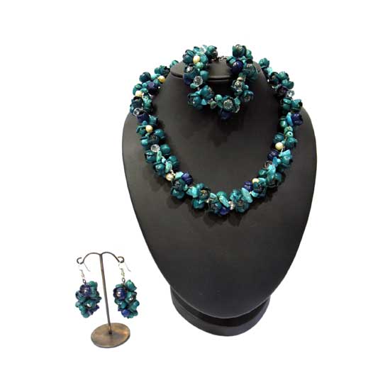This set of leather jewelry is comprised of a necklace and a pair of earrings of the same design. Each item comes with floral details in blue and green. This elegant and tasteful jewelry set is a great complement to your look.
