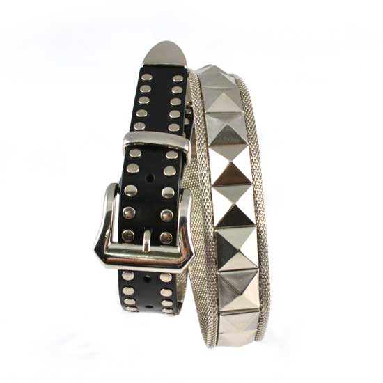 This belt combines a silvery mesh part with dark leather straps. The round studs go well with the polished faceted details on the mesh. The buckle is also sturdily made to withstand long service.
