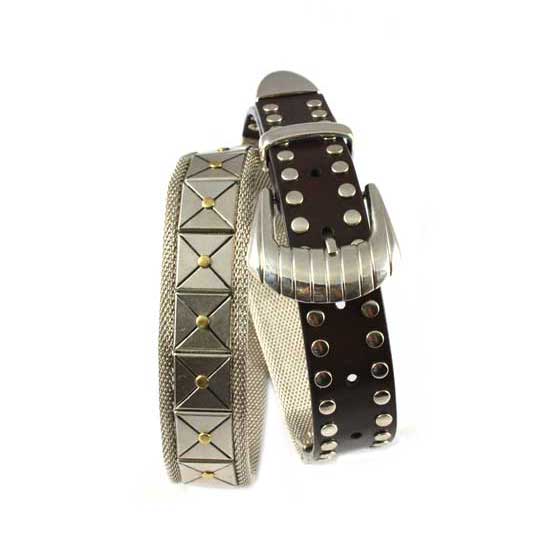 This belt alternates leather and mesh, which offers an intriguing contrast. The leather part is paved with rows of studs reminiscent of the rock style. The tip, buckle and loop come in matching silvery.