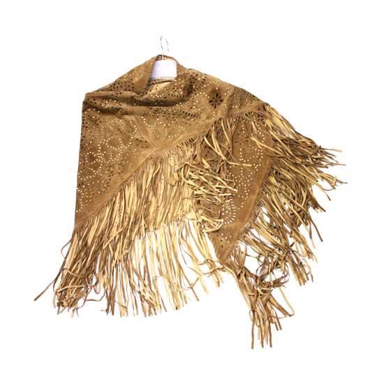 This presented leather shawl features a fringed design for added style. Flaunting a light brown hue, it is easy to mix and match. This refined leather shawl goes well with assorted outfits.