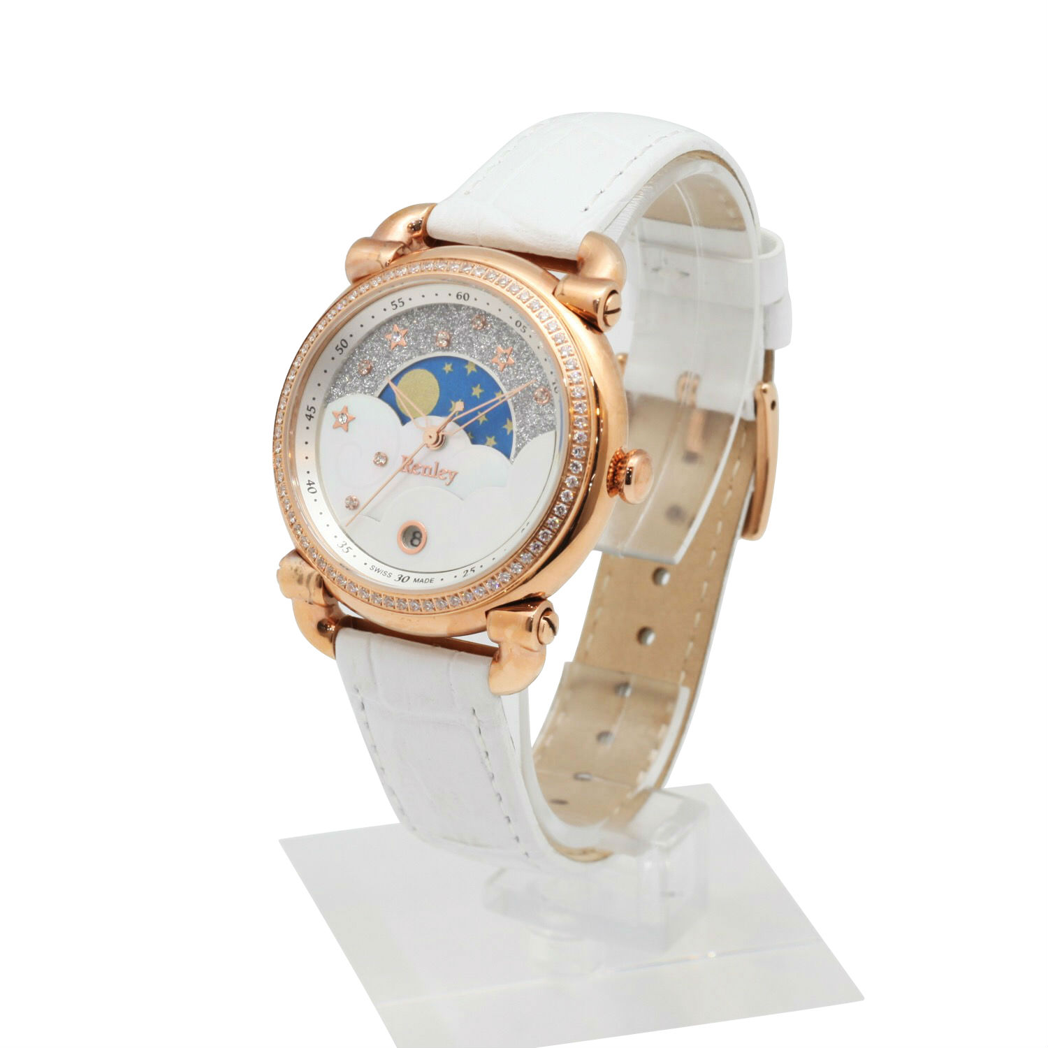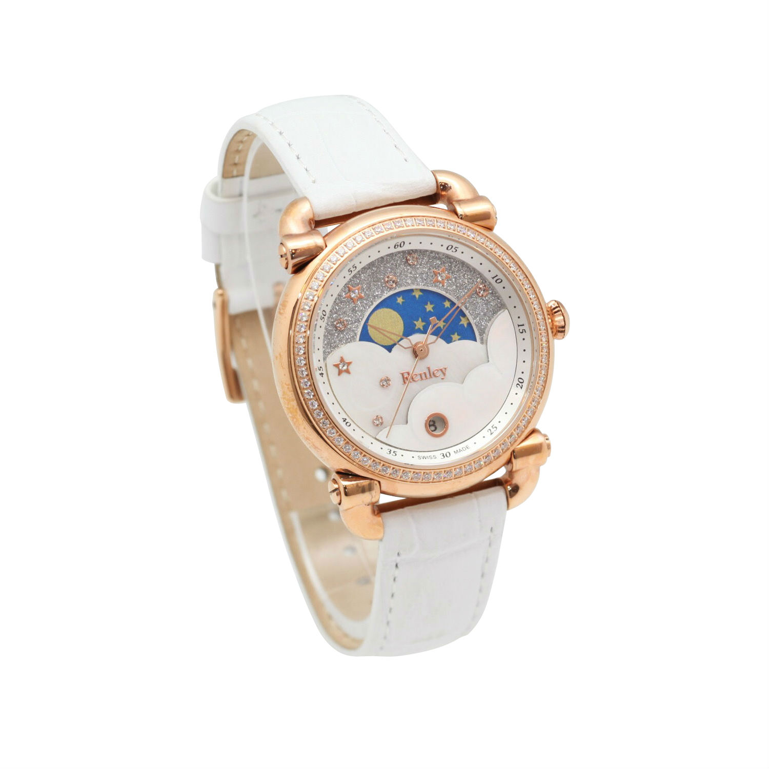 This ladies’ watch catches attentions effortlessly with its stunning night sky design. It creates a beautiful star-filled sky on the dial with glitters and stones accented. This artistic complication comes with moon phase and date display on top of the basic time telling function. Completed with a white leather strap, this charming one is an easy-to-match piece for your everyday essentials.