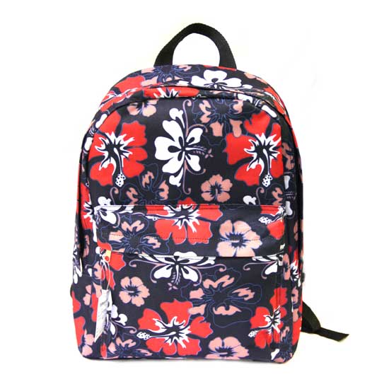 Displayed is a backpack in a leisure style. Designed with floral patterns in a red-and-black color scheme, this backpack looks trendy. This backpack offers a satisfactory capacity, making it a good choice for a weekend outing.