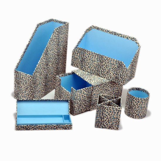 Featured here is a beautiful series of stationery set designed in leopard print. These boxes come with a blue interior that lifts the users' mood. This box series attracts female consumers especially.