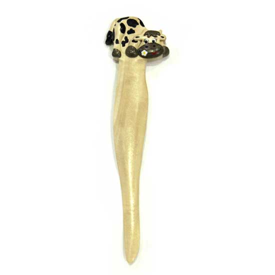 Displayed is a letter opener in a light brown color. There is a decorative cow on the top of the streamlined stick for added fun. Make opening letters more enjoyable with this high quality letter opener.