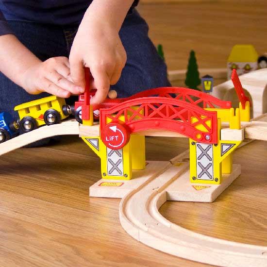 This is a toy bridge set that features a bright red & yellow bridge with a big lift button. Offering plenty of variety in play, the set comes with several track pieces and can be used with other wooden railway systems. Children will really love lowering the bridge and lifting gates to let trains go through.