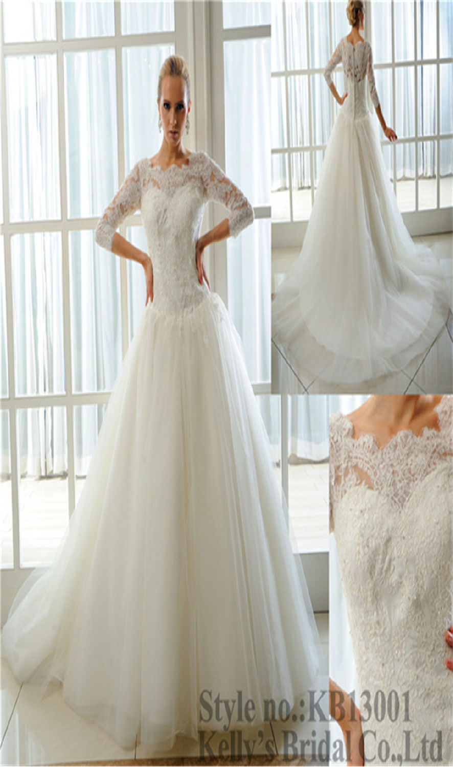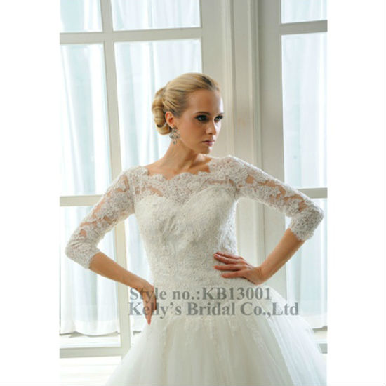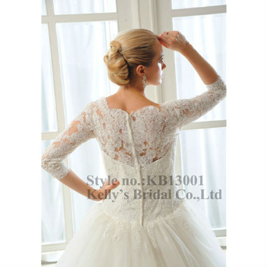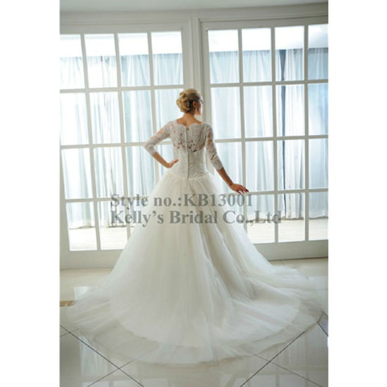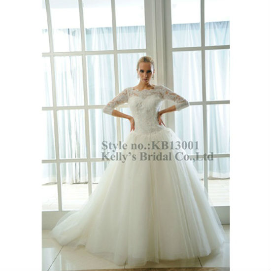 Long sleeves wedding dress, appliqued lace in the bodice, big ball gown of tulle skirt, back zipper, this dress is beautiful for the elegant brides.
