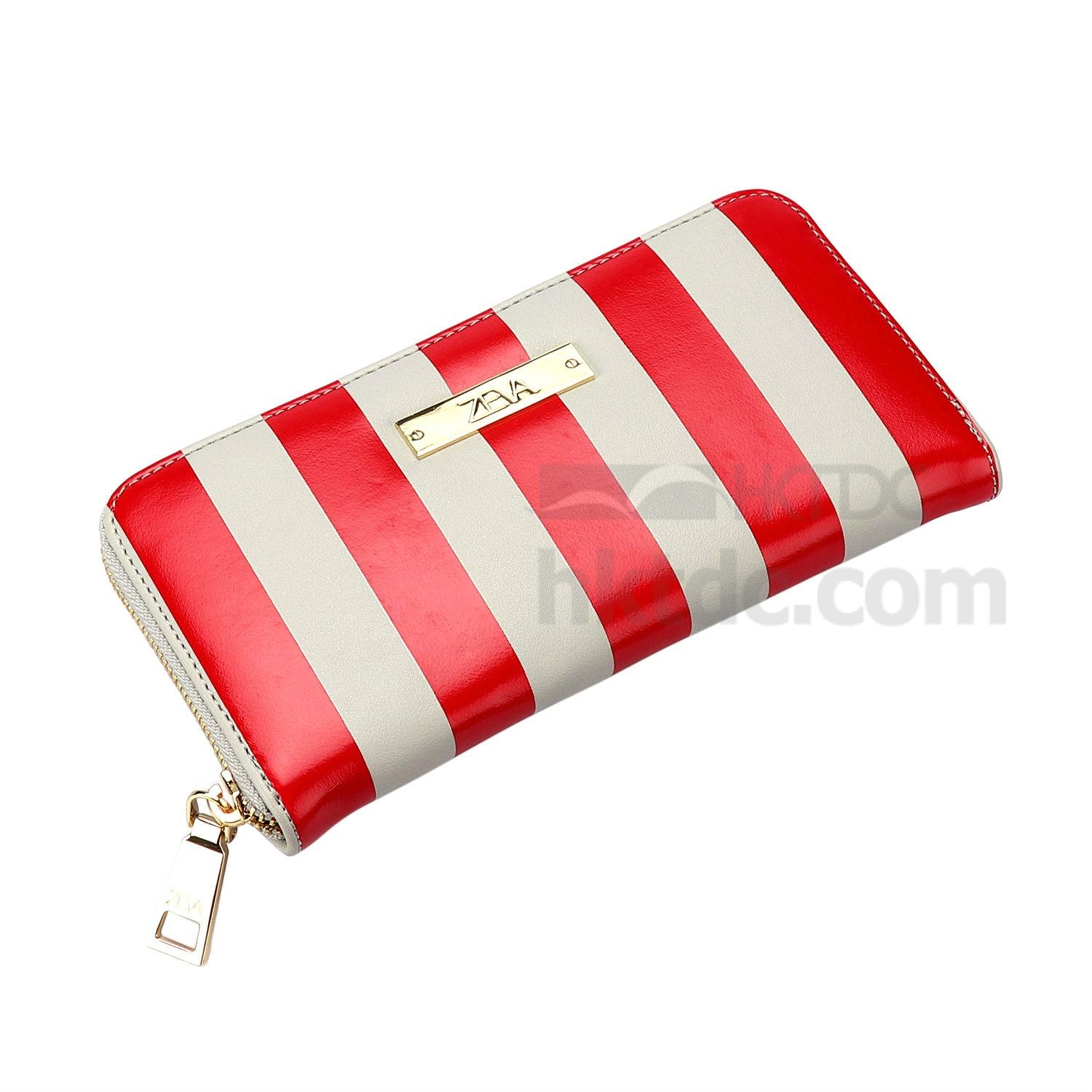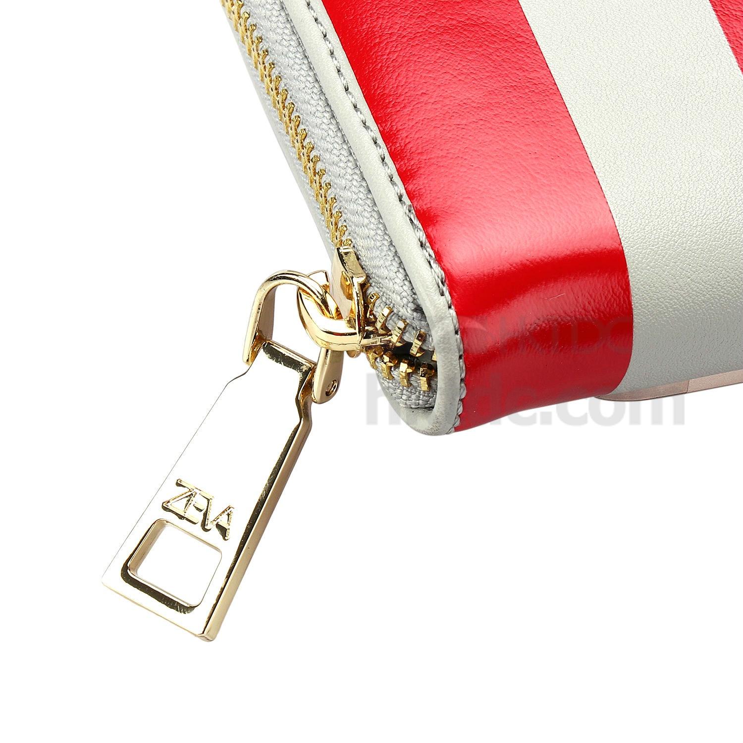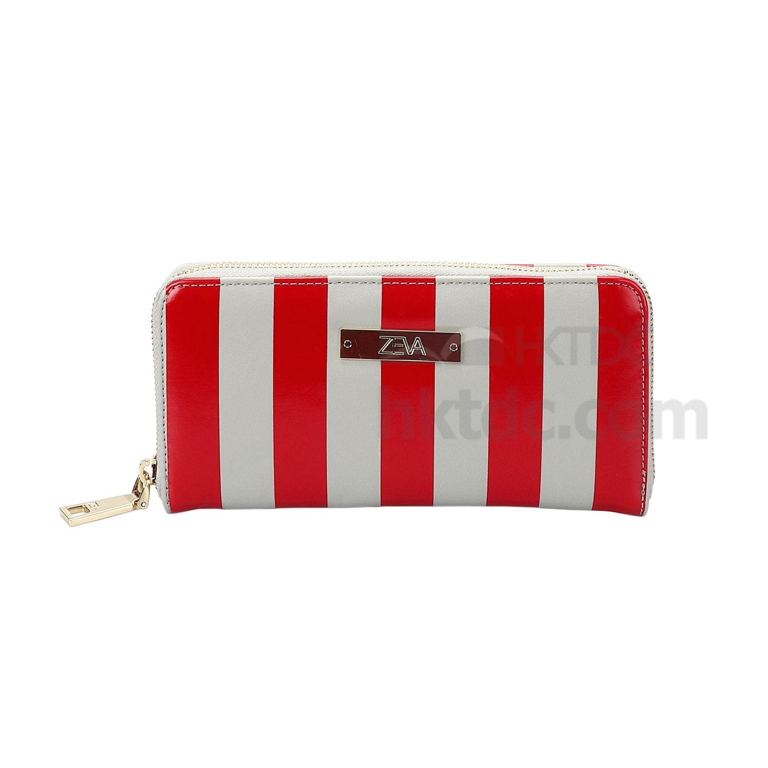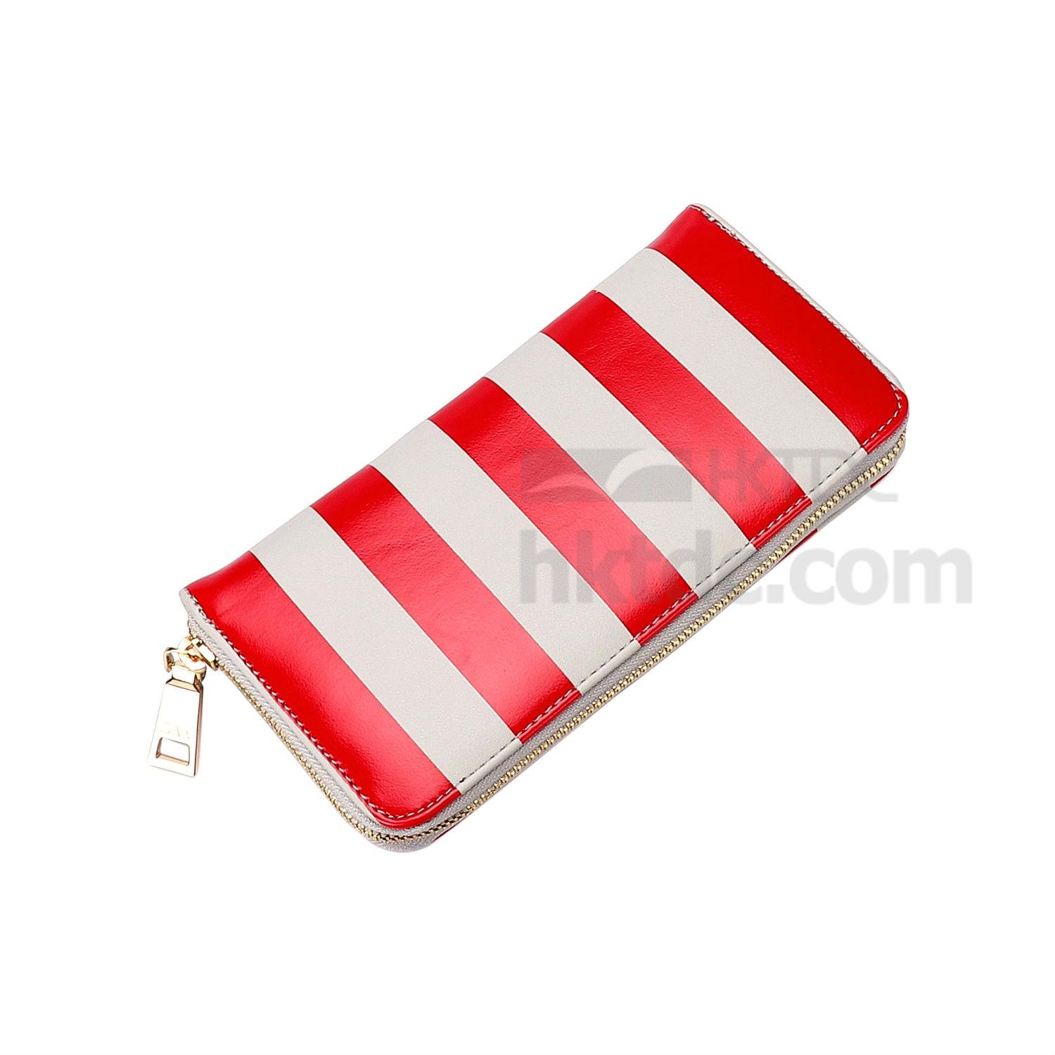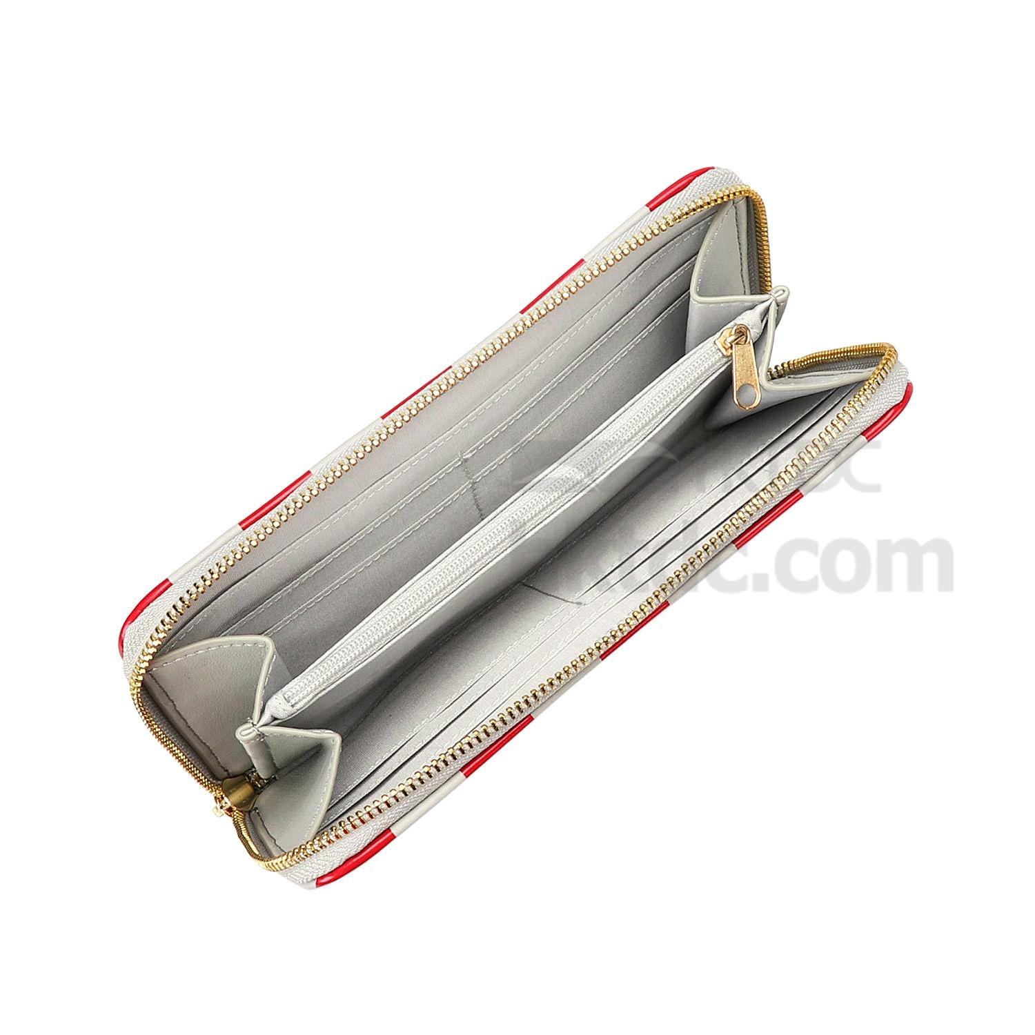 The displayed long wallet comes in fashionable design and is embellished with red and white stripes. It has multiple slots with a zippered pocket and provides organized storage for cards and cash. This ladies’ wallet has a zipper in gold tone and is excellent for everyday use.
