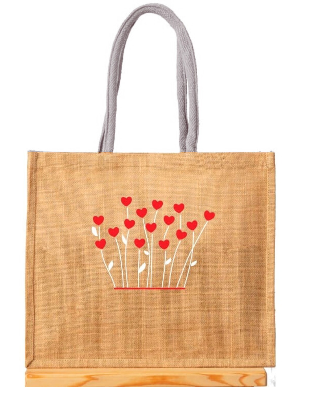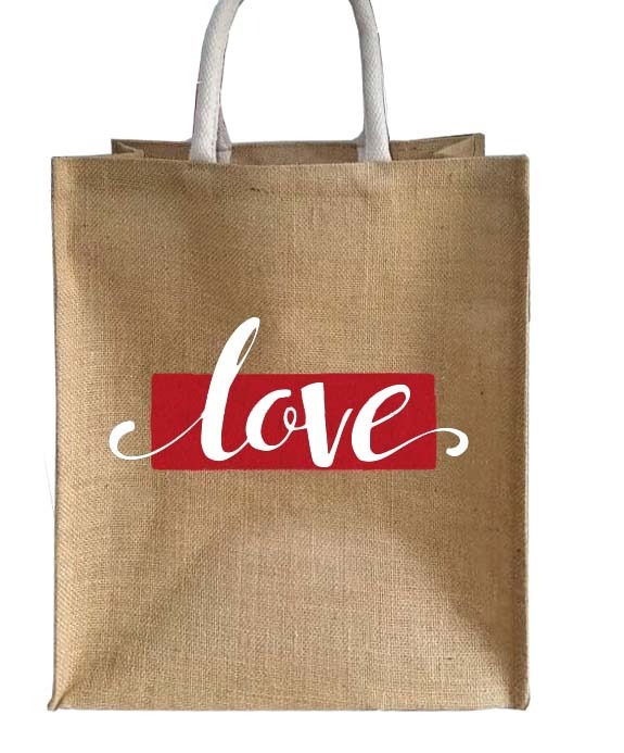 Natural Love Jute Bag. Size: 37x40x20 cm / Handle: 40 cm off white cotton tape handle with inside rope. Print: Two Color two side print - Materials PP Natural Jute. Accessories