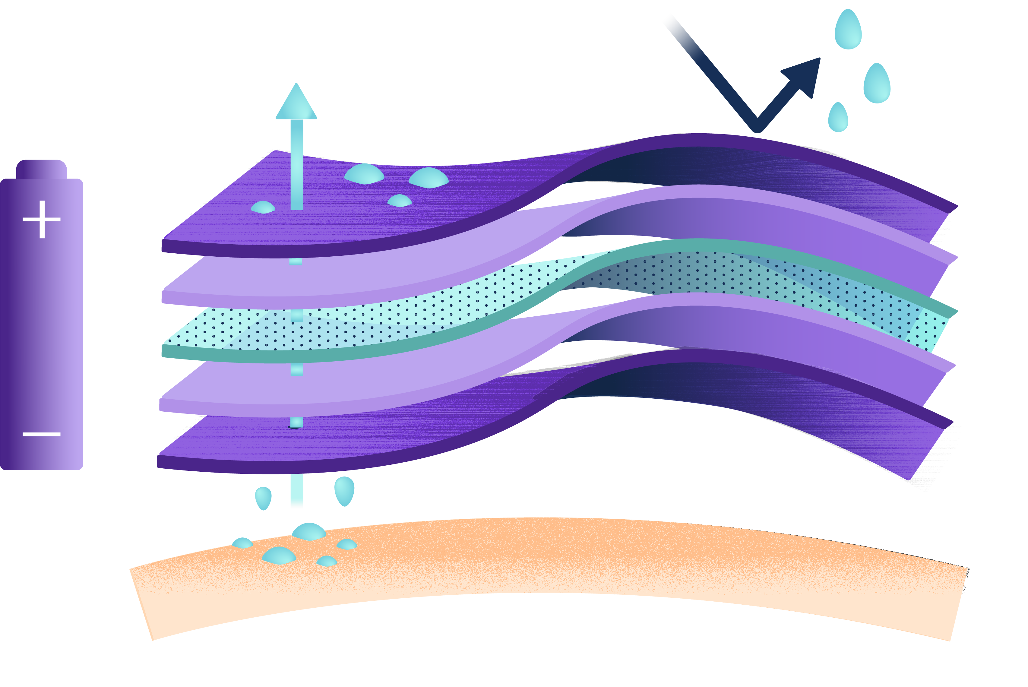 Active transport of moisture means that our technology moves liquid moisture (not just vapor), even against a pressure gradient (e.g., when it’s wet outside) from, for example, the inside of a jacket to the outside. Our patented conducting polymer electrodes make our pumps thin, flexible, lightweight and very effective.