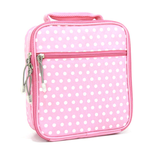 This adorable lunch bag features a sweet polka dot pattern in white on a pink surface. It comes with two zipper compartments for users' convenience. Its durable construction makes it an ideal choice for students.