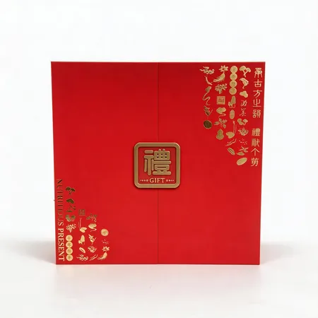 【Oriental Heritage & Craftsmanship: The Ultimate Conveyance of Brand Ritual Sense】 Artistic Fusion of Metal and Paper: At the core of the box surface, we employ an inlaid metal nameplate (as shown in Figure 1), complemented by high-precision gold-foiled lines. This presents the brand logo with an embossed texture, endowing the packaging with strong visual impact and a sense of prestige. Classic Double-Door Structure: Utilizing a precise double-door magnetic suction design, the opening and closing are smooth with strong adsorption. This opening method mimics ancient house gates, offering users a solemn and ritualistic unboxing experience. High-Saturation Chinese Red: High-quality primary red paper or specialty coated paper is selected, featuring pure color, no powder shedding, and no color bleeding. Under light, it presents a delicate silk-like texture, perfectly meeting the needs of high-end holiday gifting.