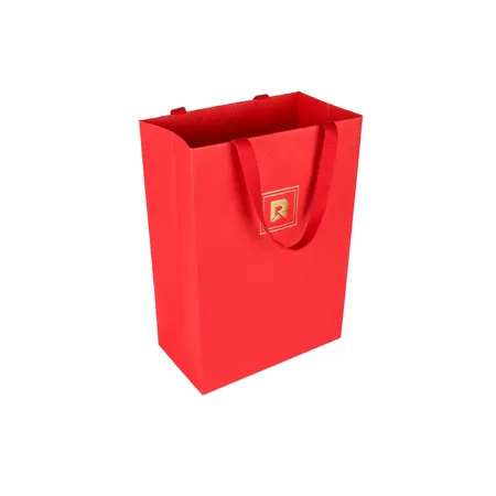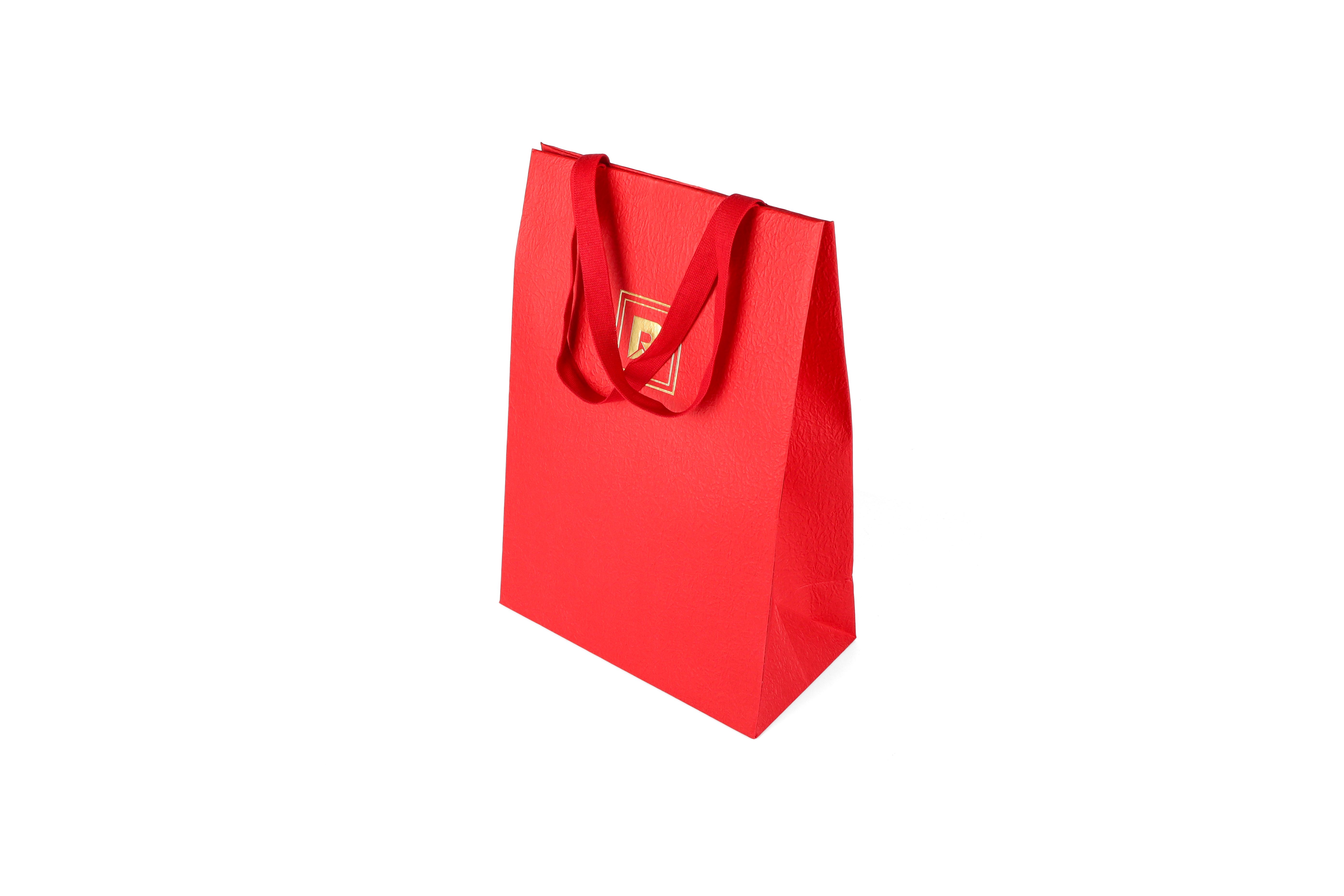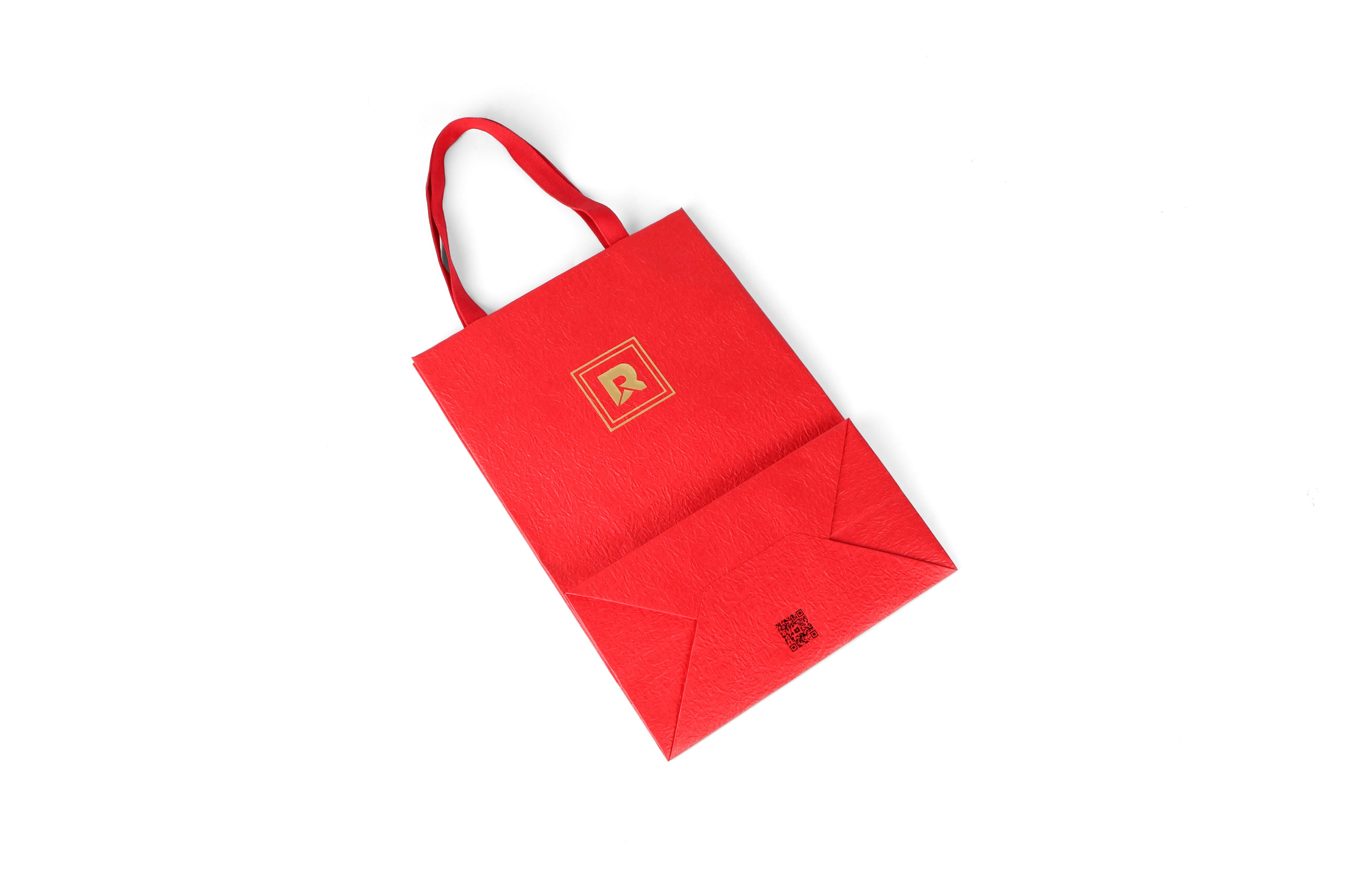 Our factory's red paper bag: Vivid red, golden logo for an elegant look. Made of quality paper, durable with a firm feel. Handy red handle, front pocket for extra storage. Perfect for gifts, shopping, events.