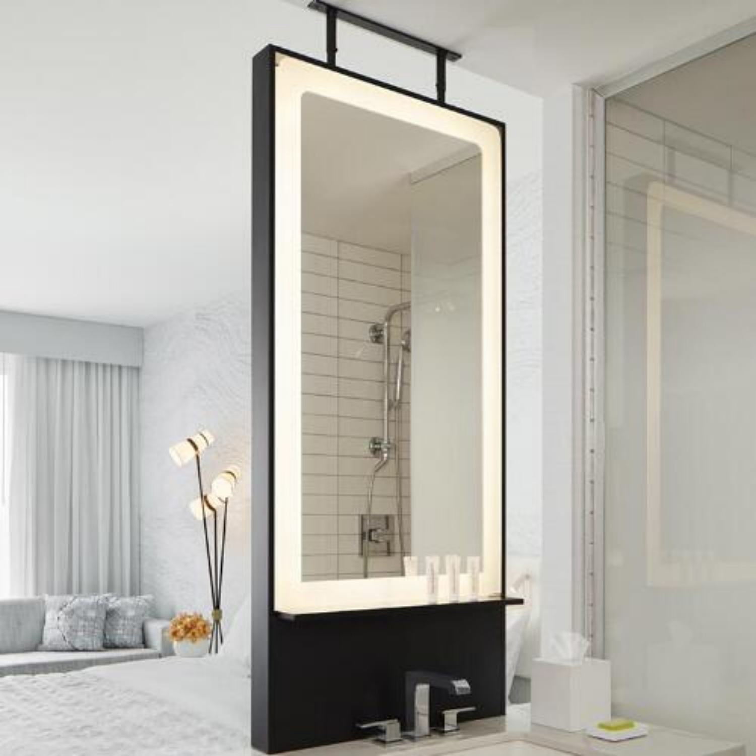 Offering stylish, modern silhouettes for residential and commercial settings alike, this elegant black framed LED mirror with shelf adds a new view to the surroundings. This luxury hotel bathroom mirror stands on the vanity top, fixed to the ceiling by 2 adjustable metal tubes. Showcasing a perfect rectangular frame made of smooth metal, this stunning illuminated bathroom mirror with shelf brings additional functionality to the space. The slim shelf is wide enough for a variety of objects. The perimeter frosting band with LED strip lights ensures bright illumination for makeup, hair drying, etc.