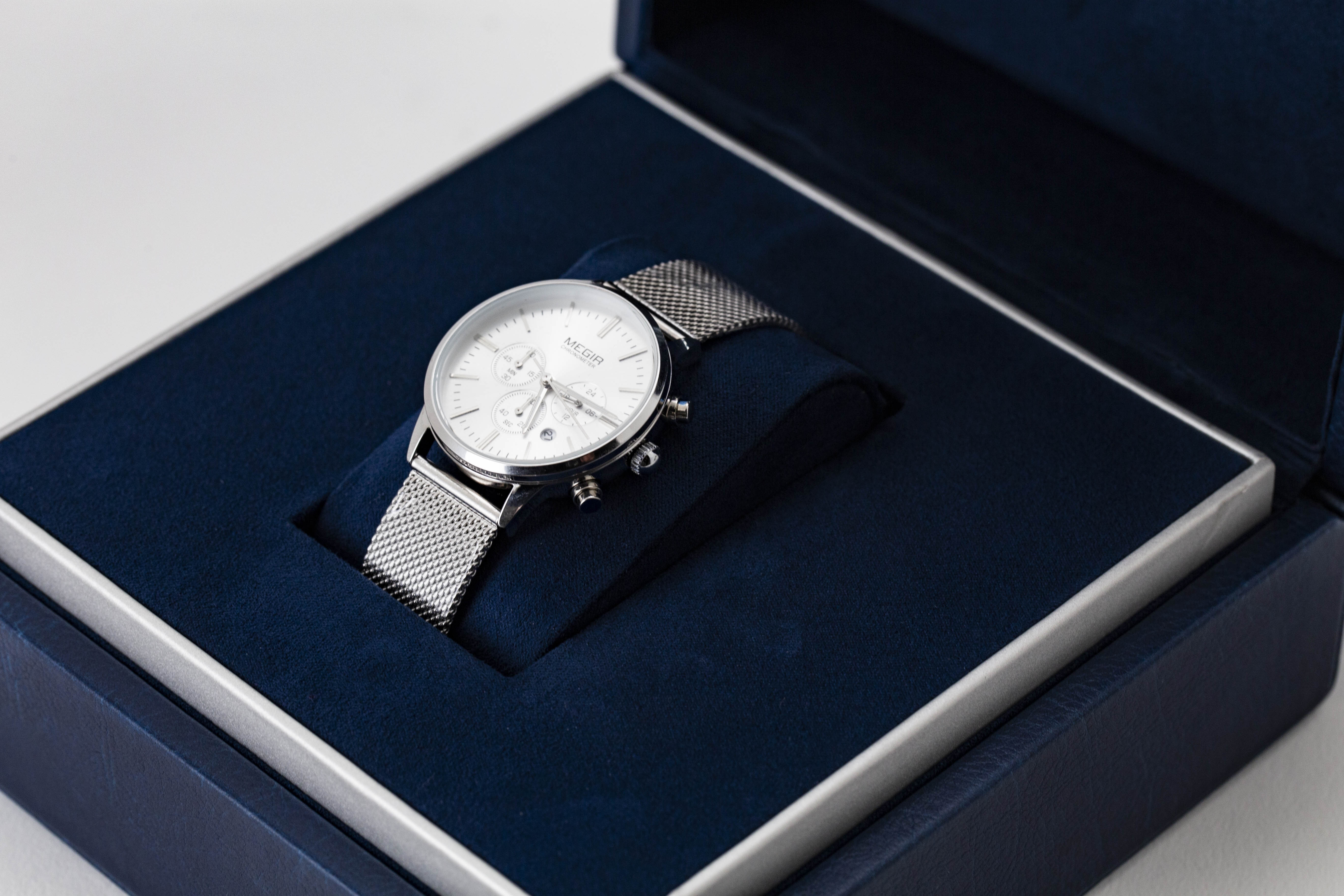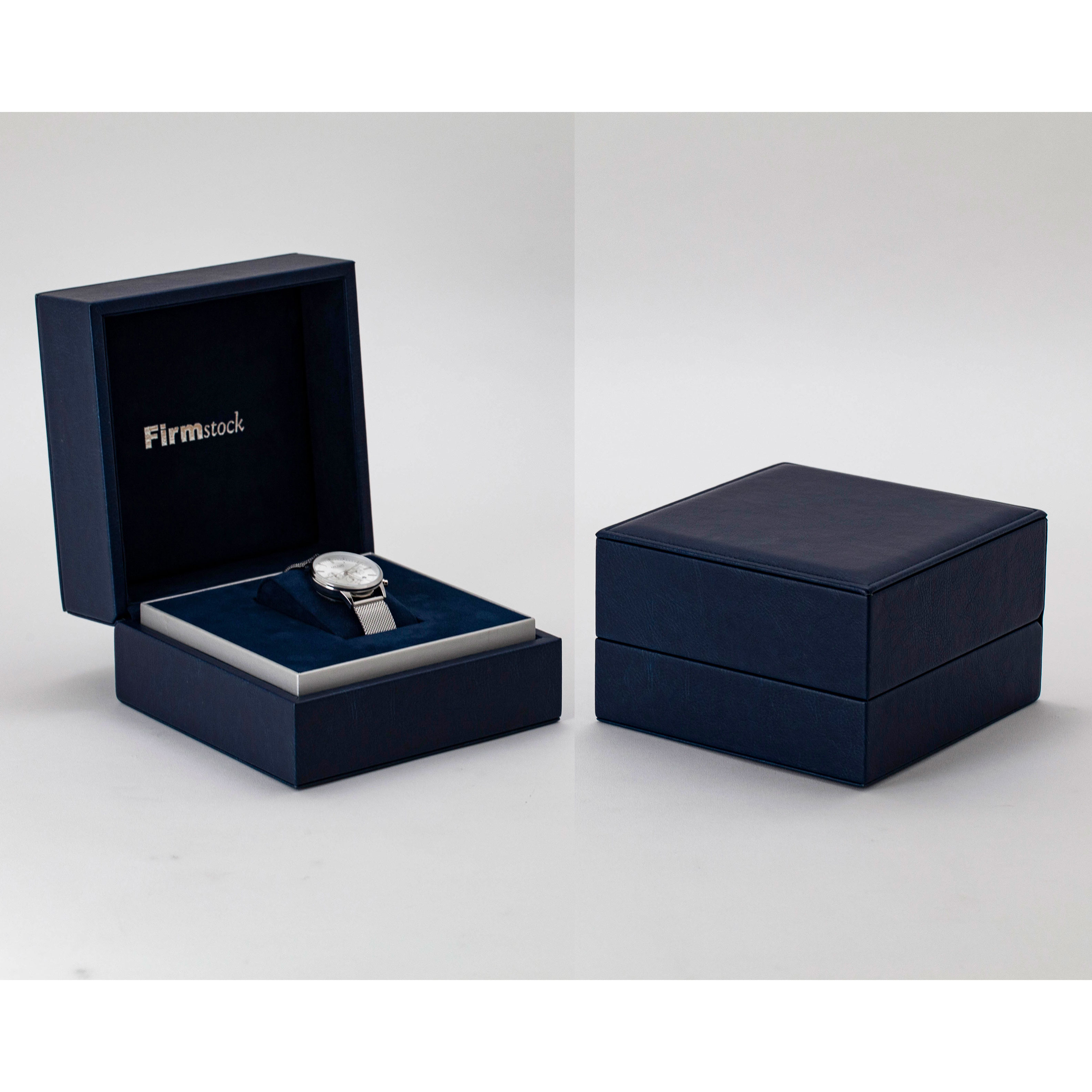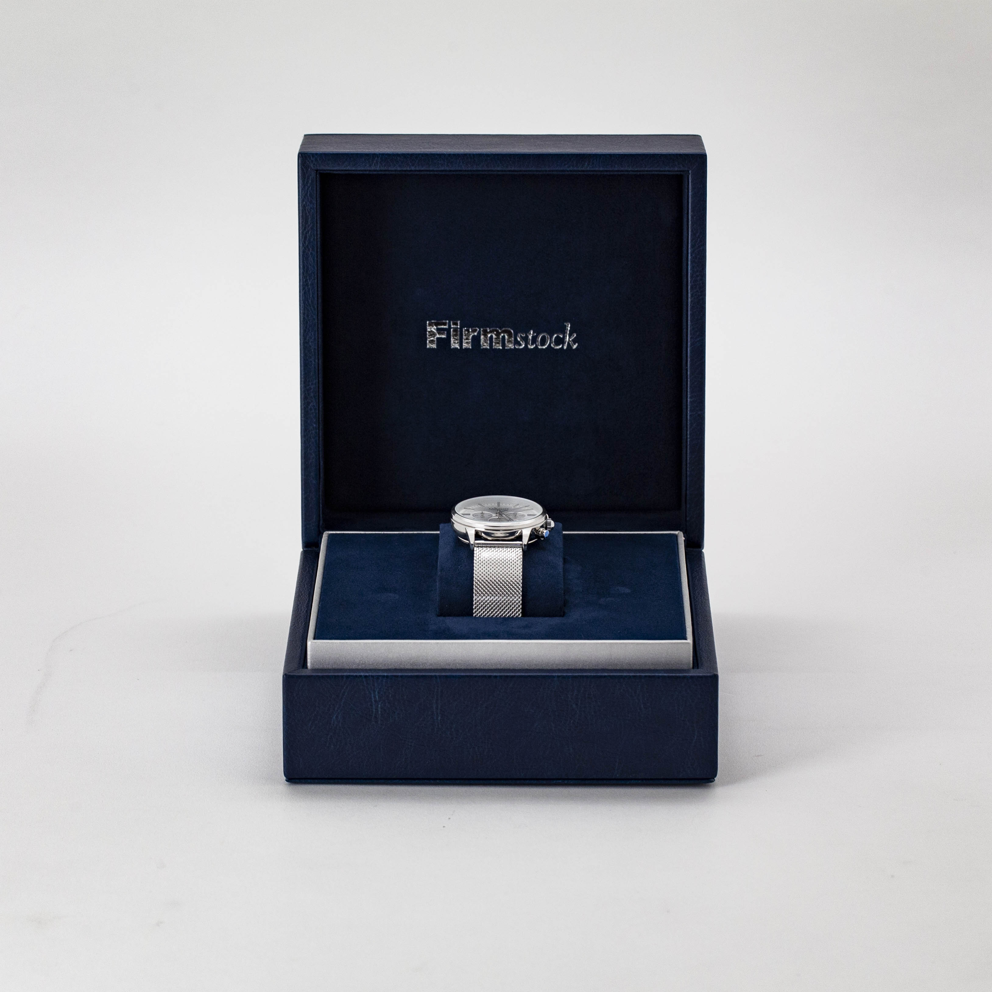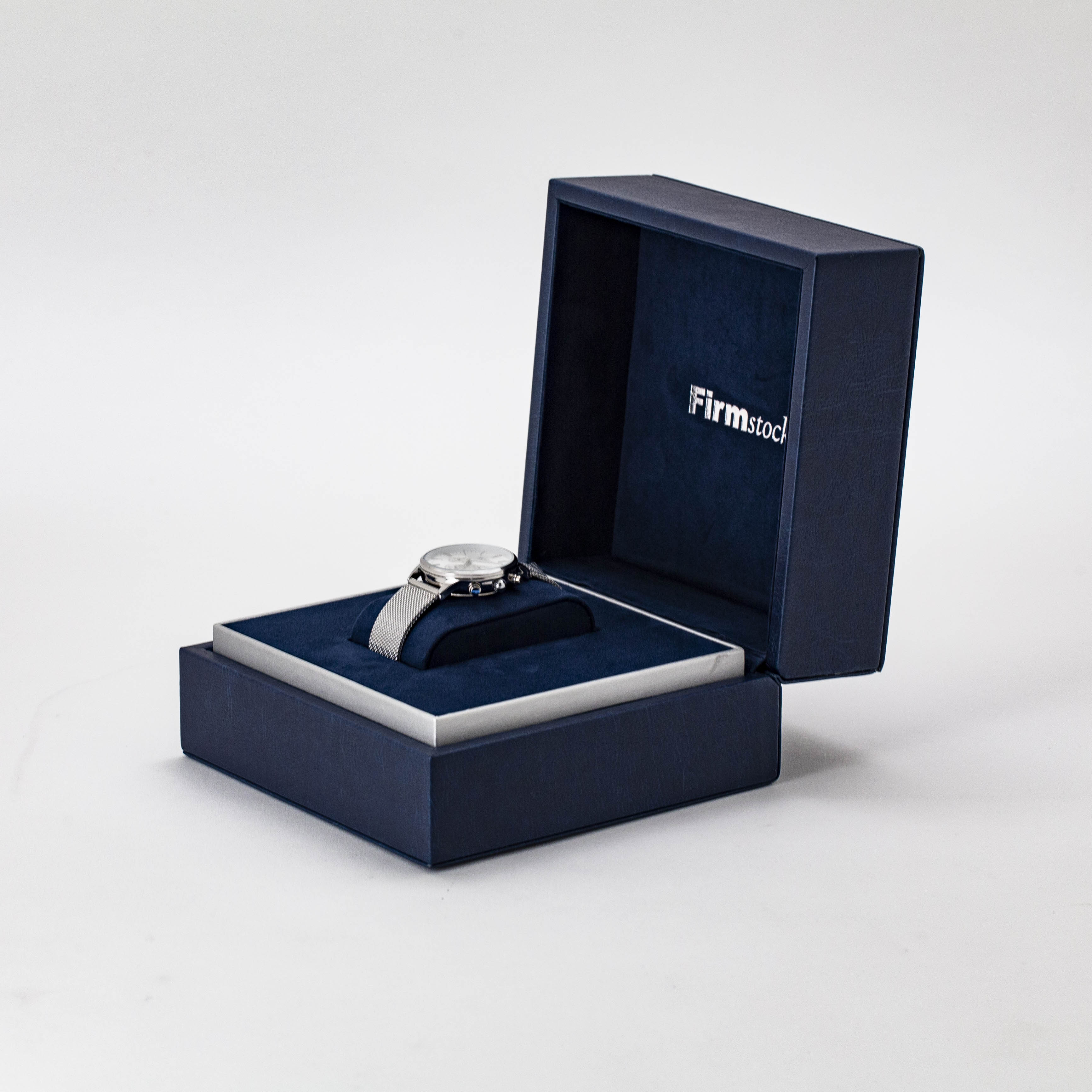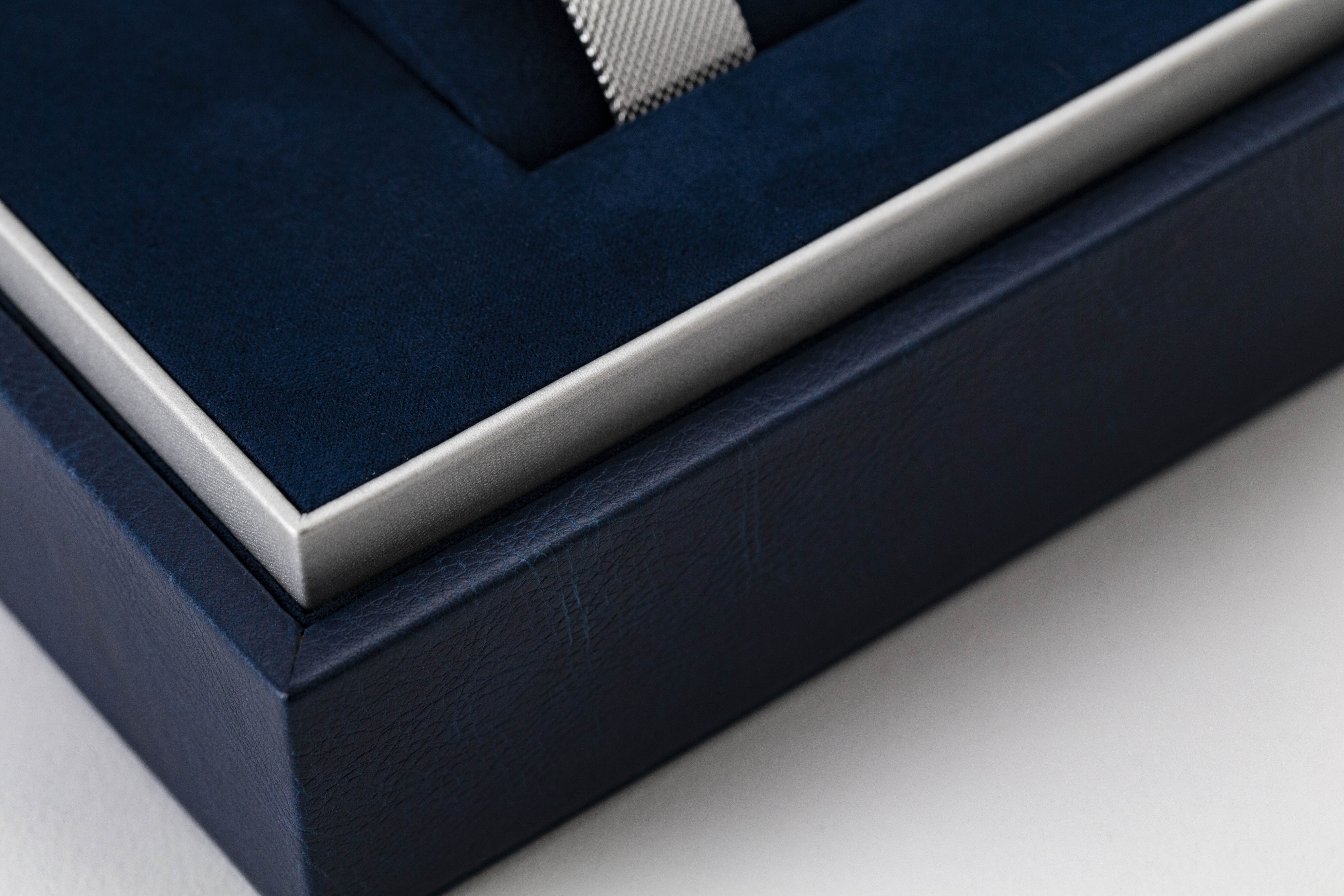 Inside : inner base frame wrapped by sliver PU leather , laminated blue velvet ,with a slot for single watch