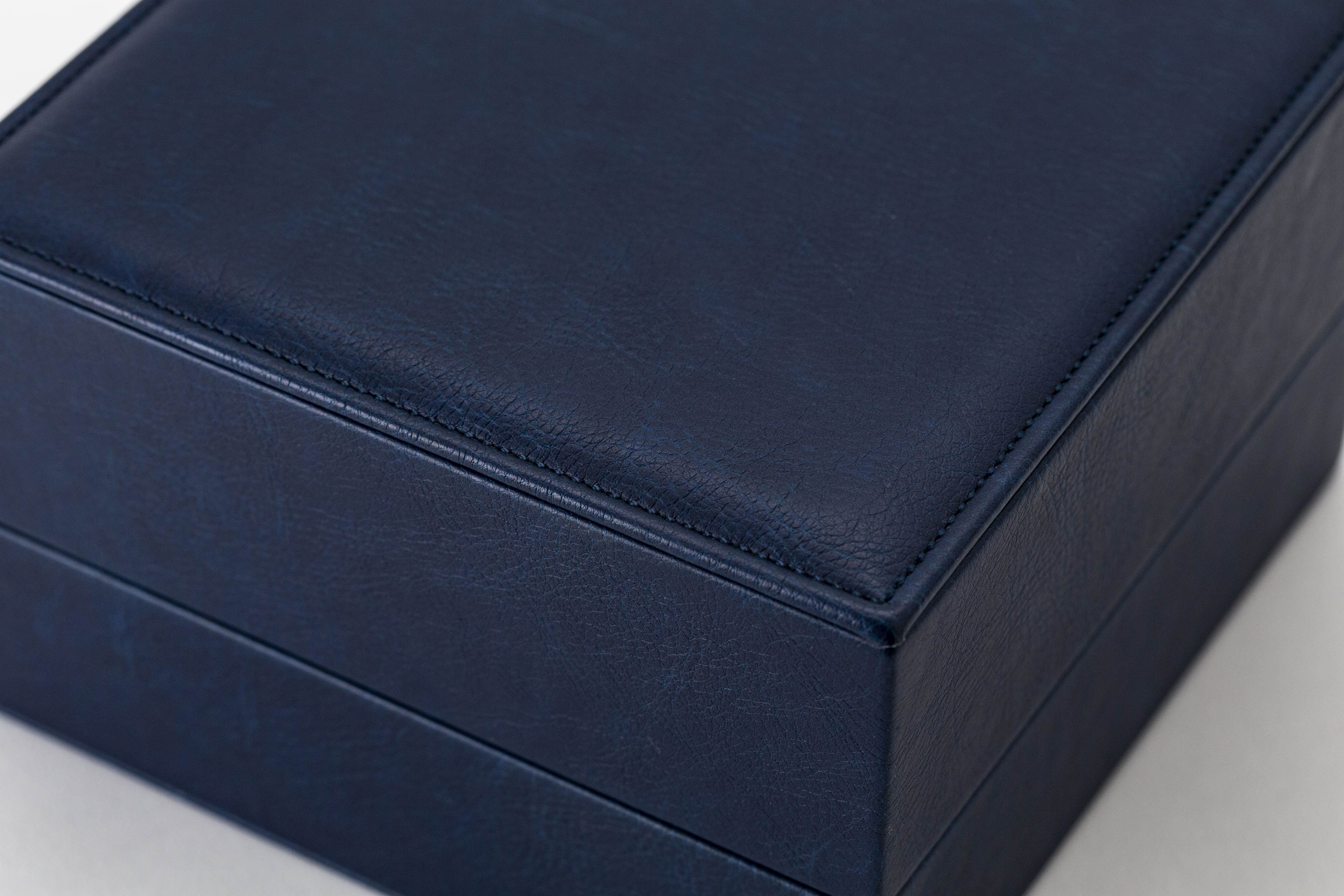 Outside : with foam on the box top, Wrapped by Blue PU leather