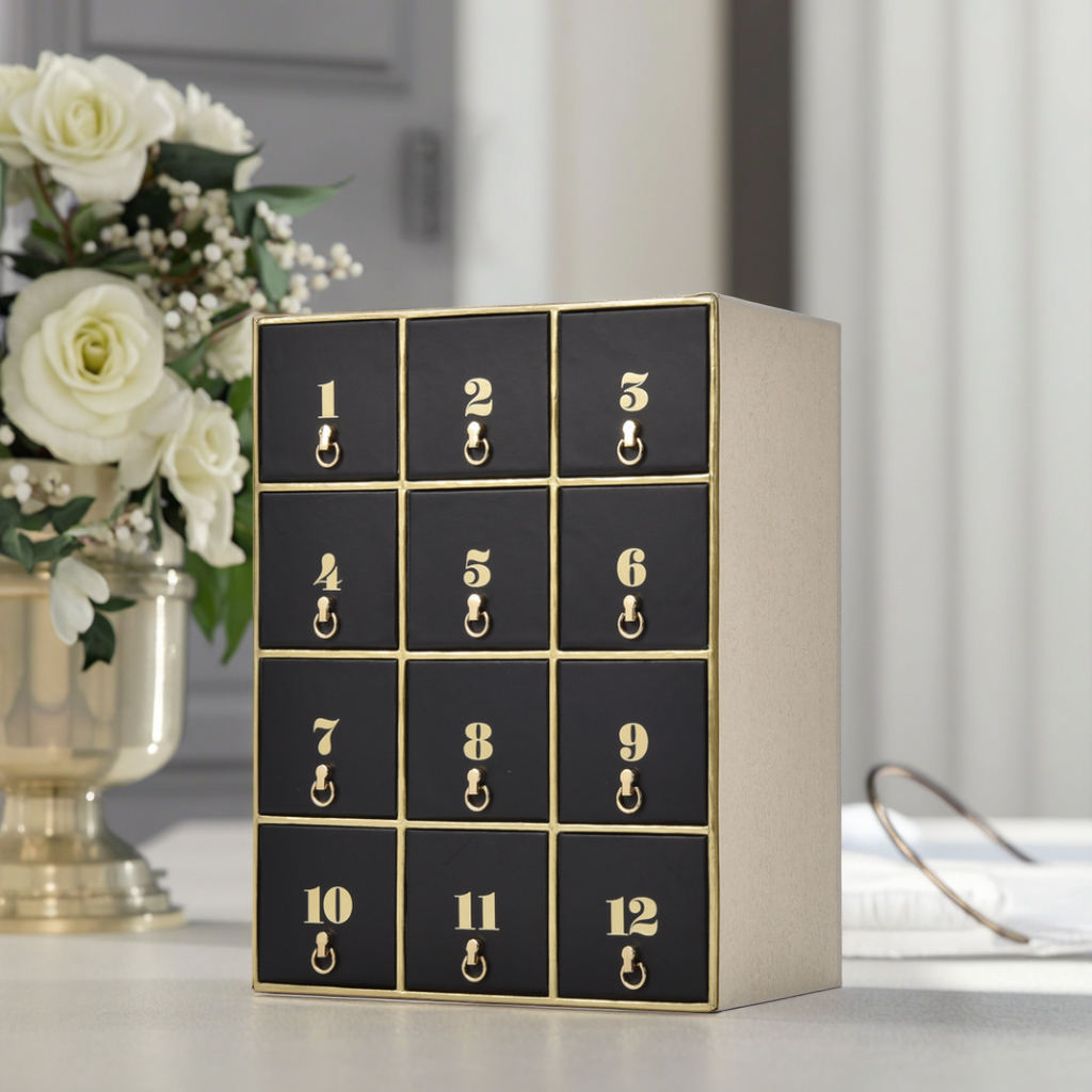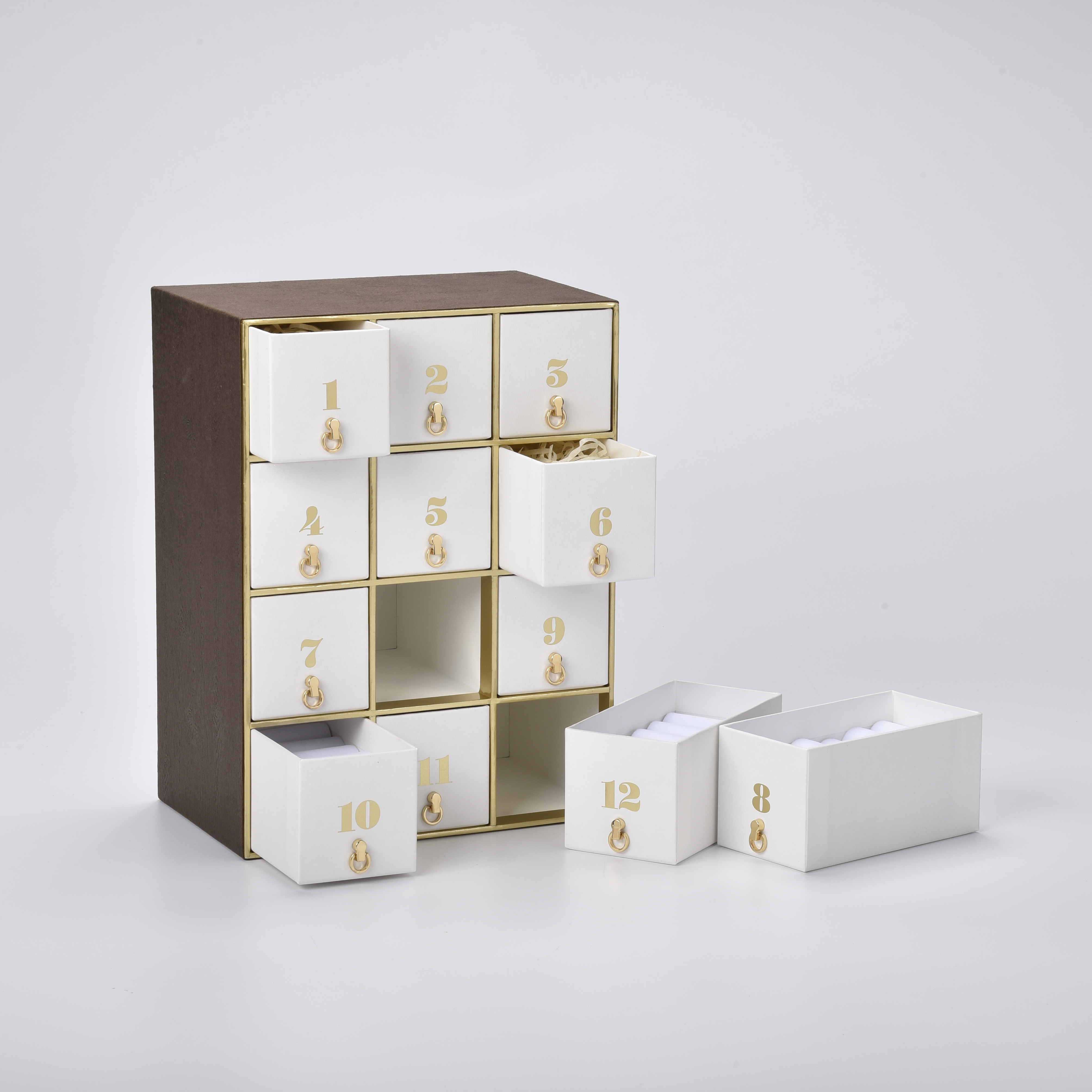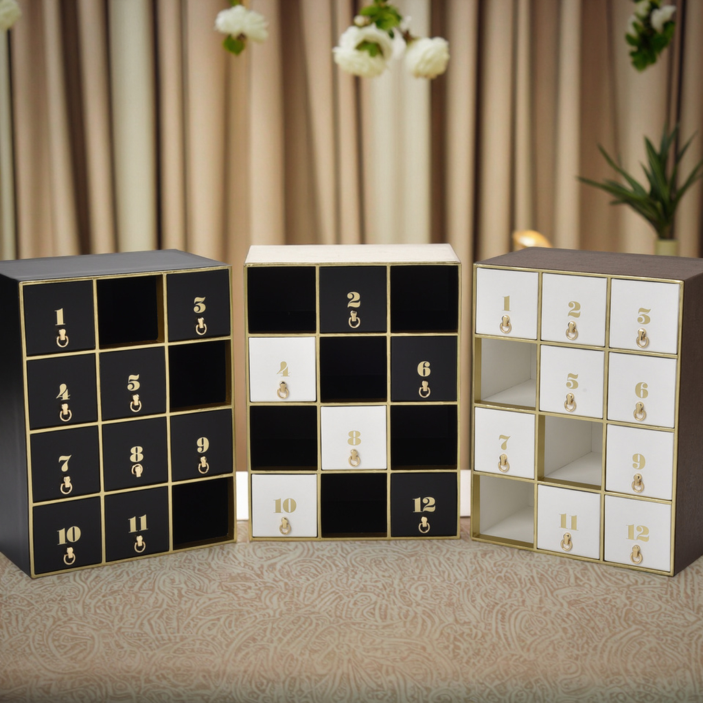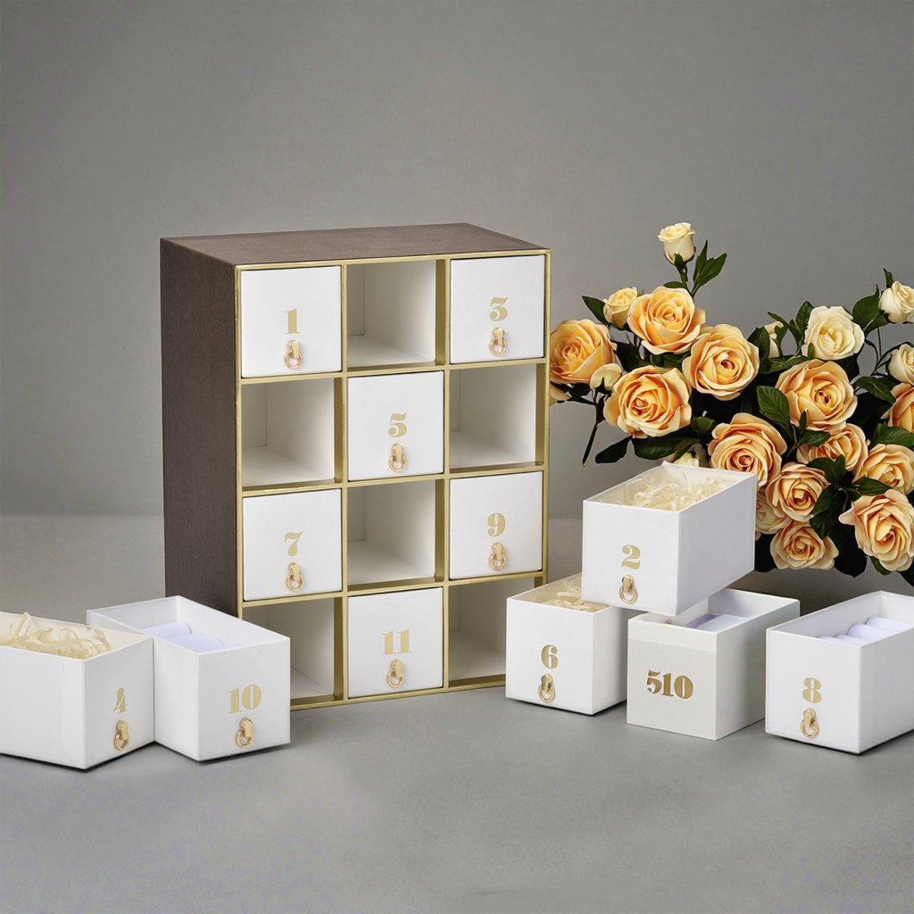 An exquisite 12-compartment drawer storage gift box. The design inspiration comes from a retro dressing cabinet, which combines practical storage with the function of a high-end gift box. Each drawer is marked with a number (1-12), allowing for the classified storage of small items such as jewelry, cosmetics, and stationery. The wooden texture surface is decorated with gilding, exuding a light luxury feel.