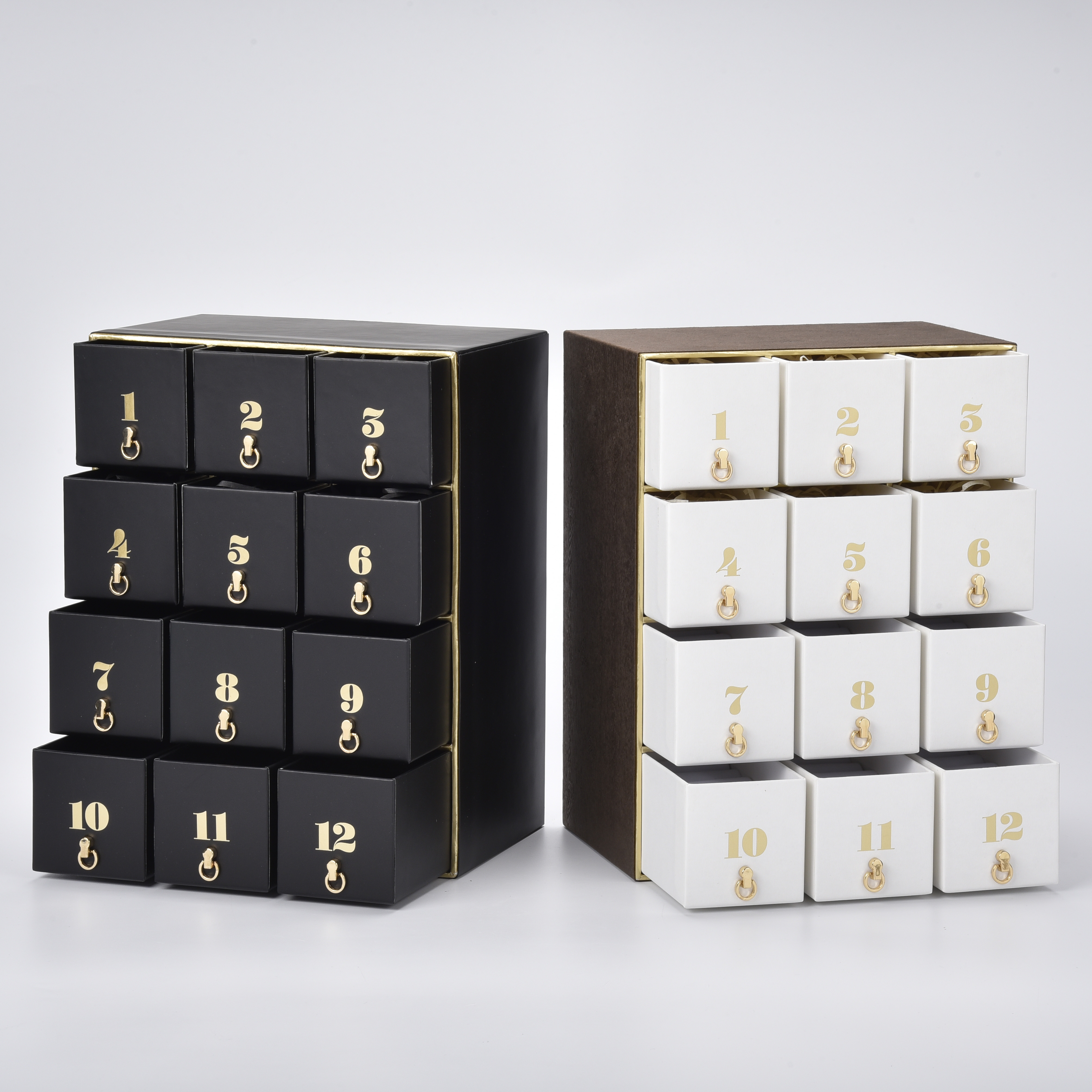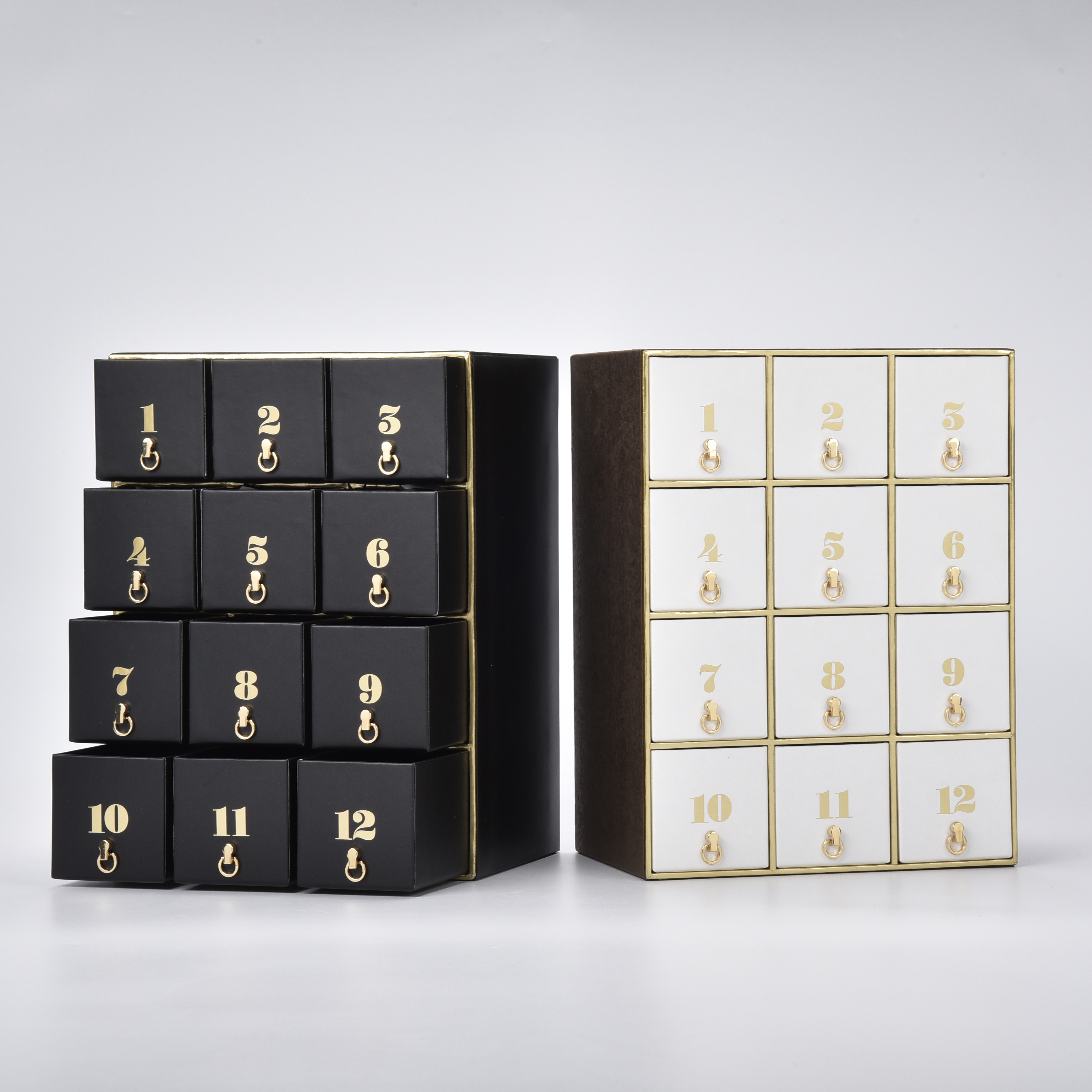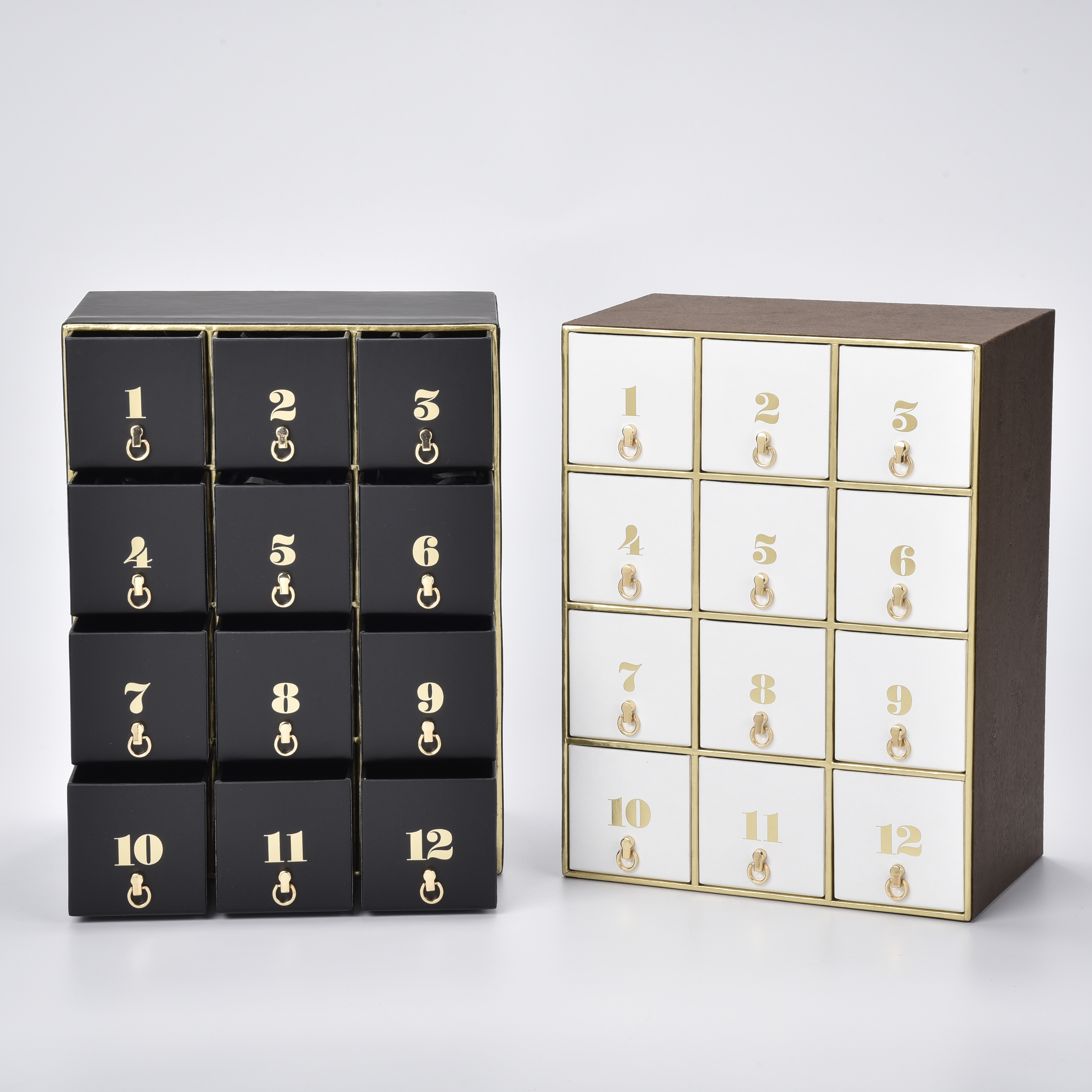 An exquisite 12-compartment drawer storage gift box. The design inspiration comes from a retro dressing cabinet, which combines practical storage with the function of a high-end gift box. Each drawer is marked with a number (1-12), allowing for the classified storage of small items such as jewelry, cosmetics, and stationery. The wooden texture surface is decorated with gilding, exuding a light luxury feel.