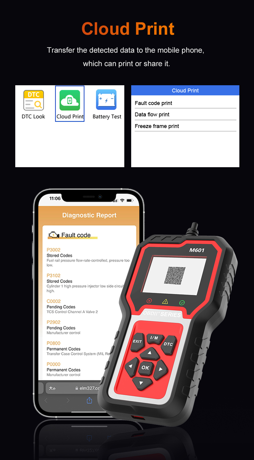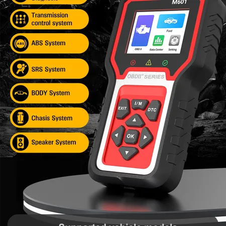 This advanced OBD2 diagnostic tool offers comprehensive vehicle system coverage, including engine system diagnosis, transmission control, ABS, airbag, body control, chassis control, and speaker control systems. It features essential functions like reading/clearing fault codes, real-time data streaming, system upgrade capability, data playback, and cloud printing, all displayed on a clear 2.8-inch color screen.
