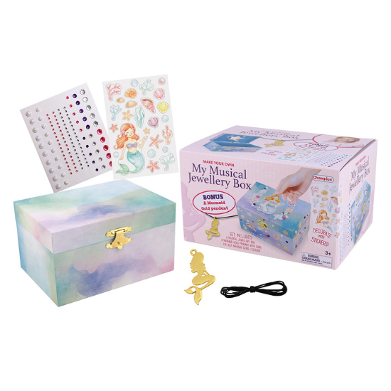 Create your very own music box with mermaid stickers and gemstones! This set includes a music box, 1 mermaid gold pendant with cord, 118 self-adhesive gems and 1 mermaid-themed sticker.