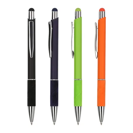 PUSH ACTION METAL TOUCH SCREEN STYLUS PEN, COLOURED RUBBERIZED ALUMINUM BARREL, VELVET FABRIC WRAPPED GRIP, METAL CLIP, CHROME PLATED PLASTIC TRIMS, TOP WITH SOLID COLOURED TOUCH SCREEN STYLUS, X-20 SLIM REFILL.