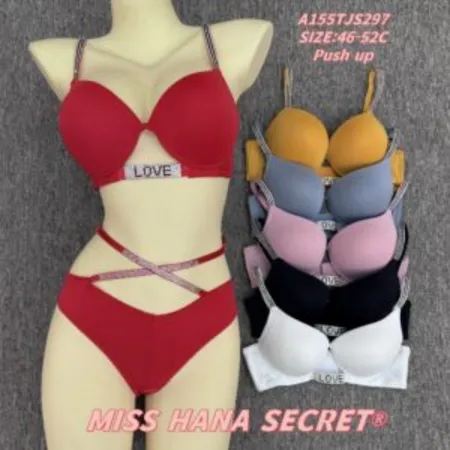 Upgrade your intimate wear with this MISS HANA SECRET push up lingerie set! Featuring a supportive push-up bra (adorned with a cute "LOVE" label) and a stylish crisscross-waist bikini bottom, it’s available in bold red, sunny yellow, soft pink, classic black, and clean white. Designed for size 46-52C (style A155TJS297), this set blends flattering lift, comfortable fabric, and trendy details—perfect for feeling confident and chic.