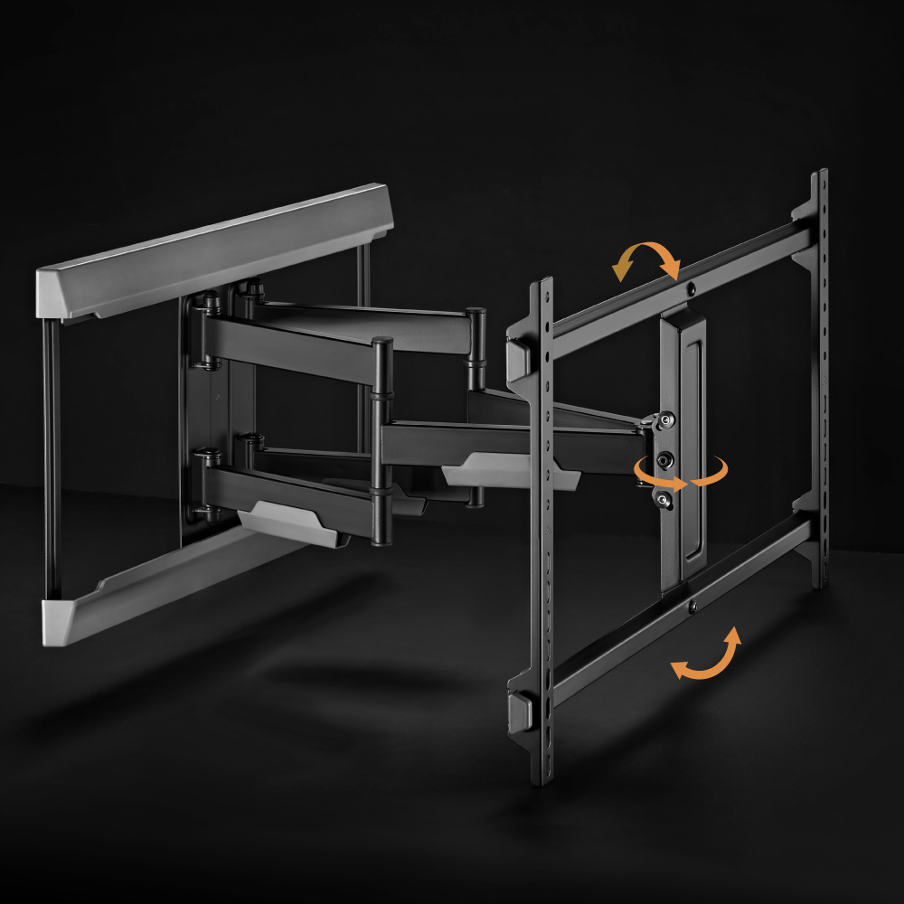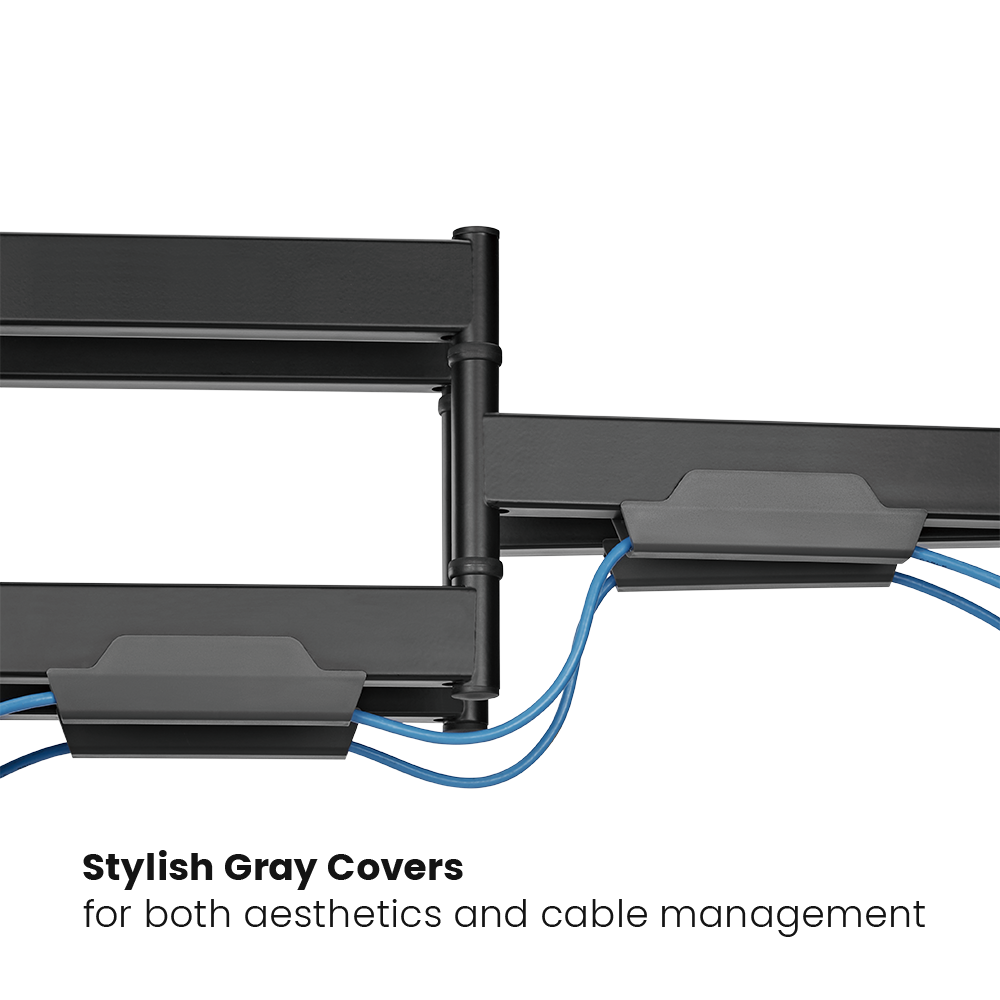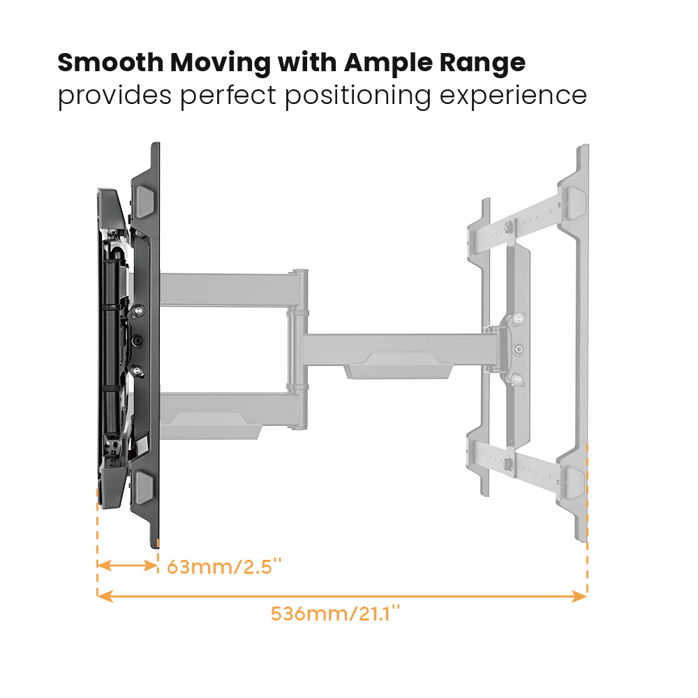 With practical detailed features, the target of LPA76-486 Full Motion TV Mount is to help you stand out in the middle market. The lateral shift wall plate perfectly fits off-center studs, ensuring the TV is at the center of wall or any desired position. Essential adjustment including +5°~-10° tilt, +60°~-60° swivel and +3°~-3° screen level is smoother and stable than before. 63~536mm (2.5"~21.1") profile ensures a better positioning experience. Strong arms securely hold up to 60kg/132lbs. New gray covers even add a dash of freshness while serving as cable management. It’s time to get it and win more market share!