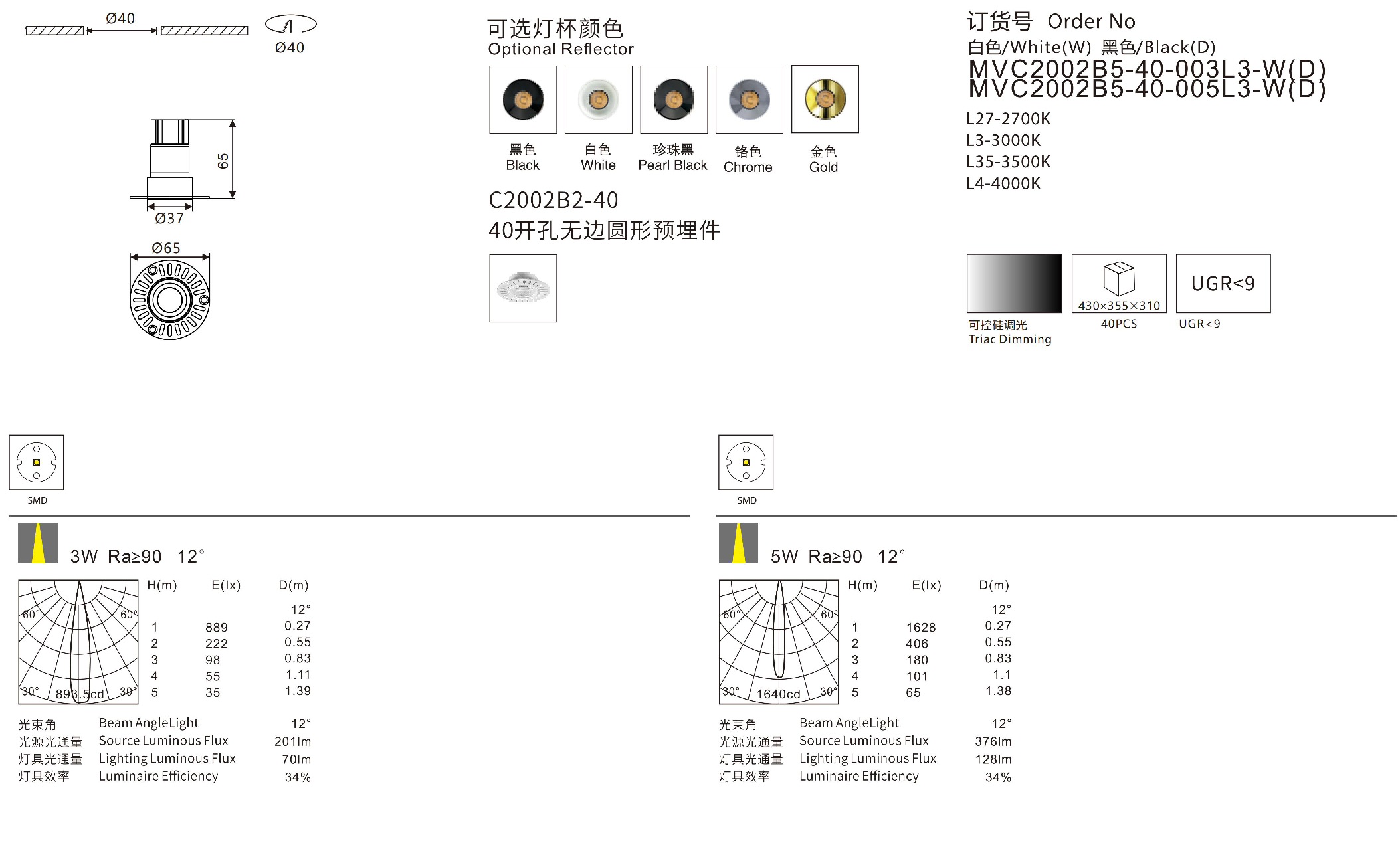 功率: 3W/5W色温: 2700K/3000K/3500K/4000K/5000K光束角: 12°