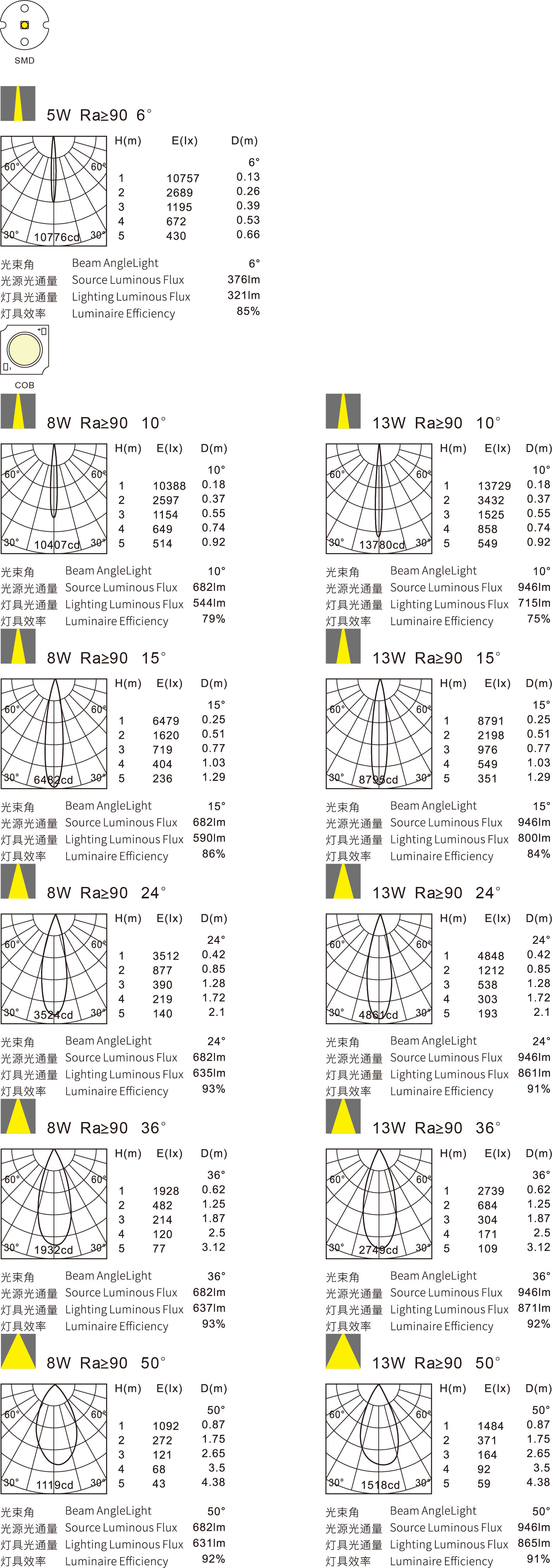 功率: 5W/8W/13W色温: 2700K/3000K/3500K光束角: 6°, 10°, 15°, 24°, 36°, 50°