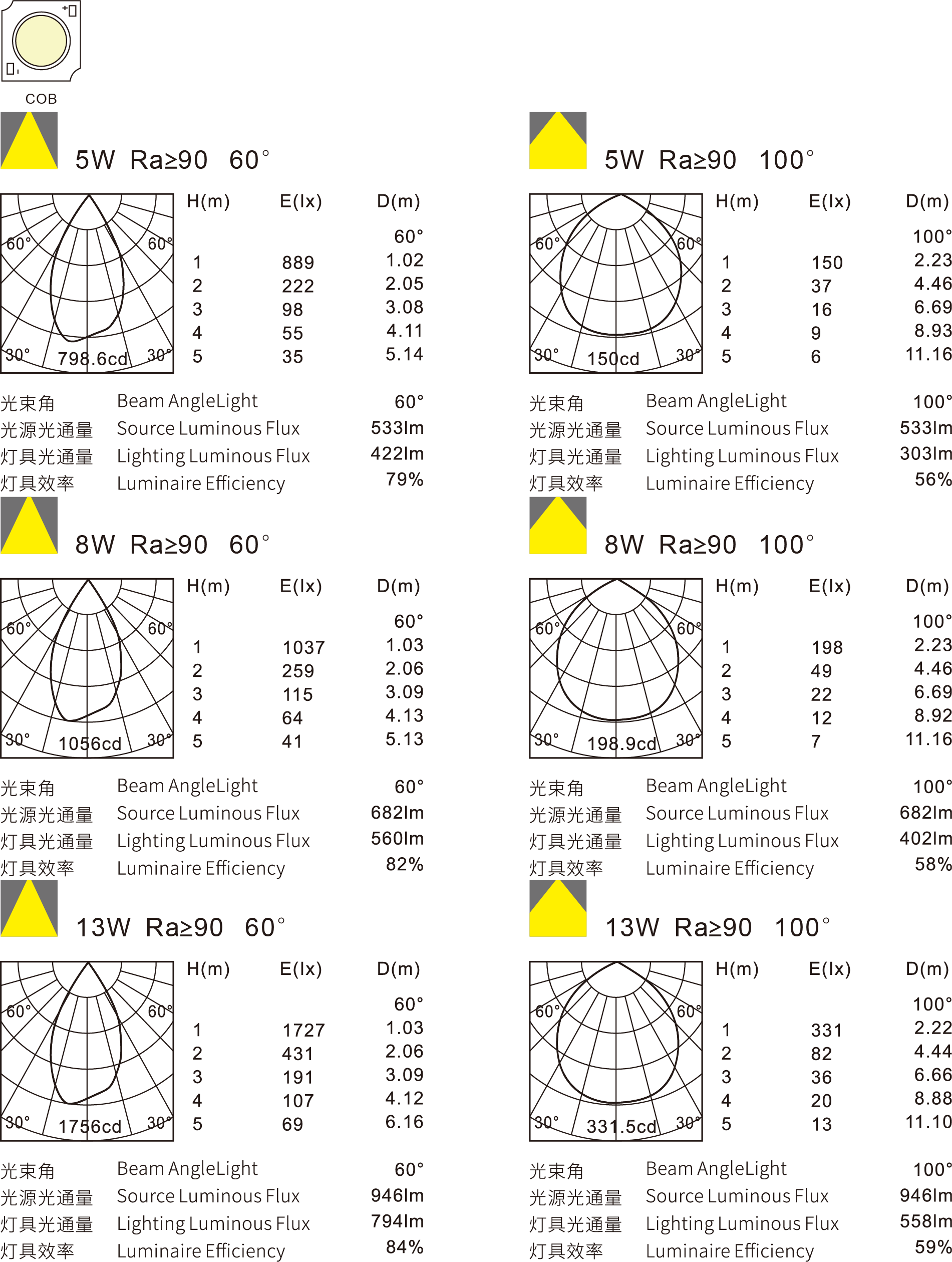功率: 5W/8W/13W色温: 2700K/3000K/3500K光束角: 60°, 100°,