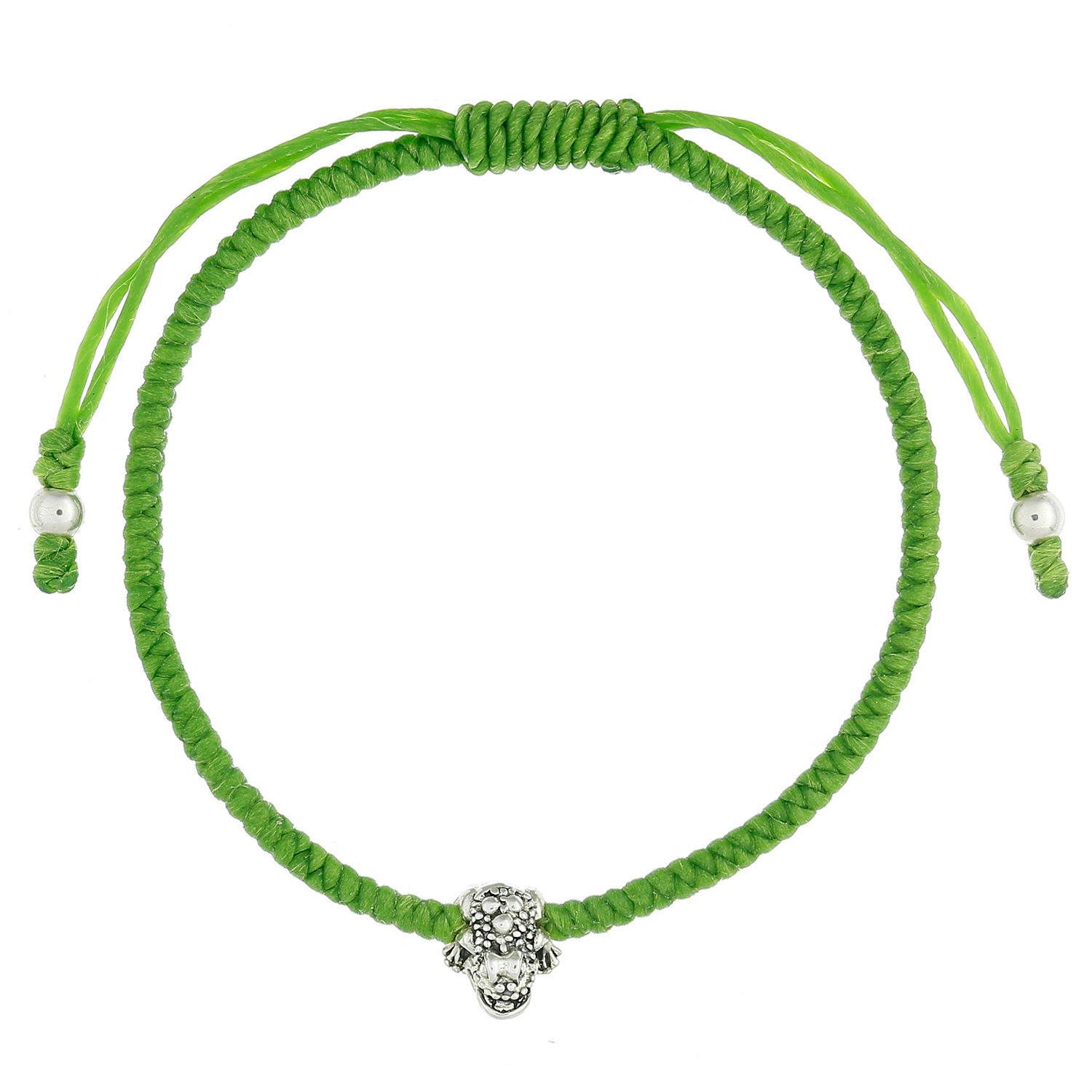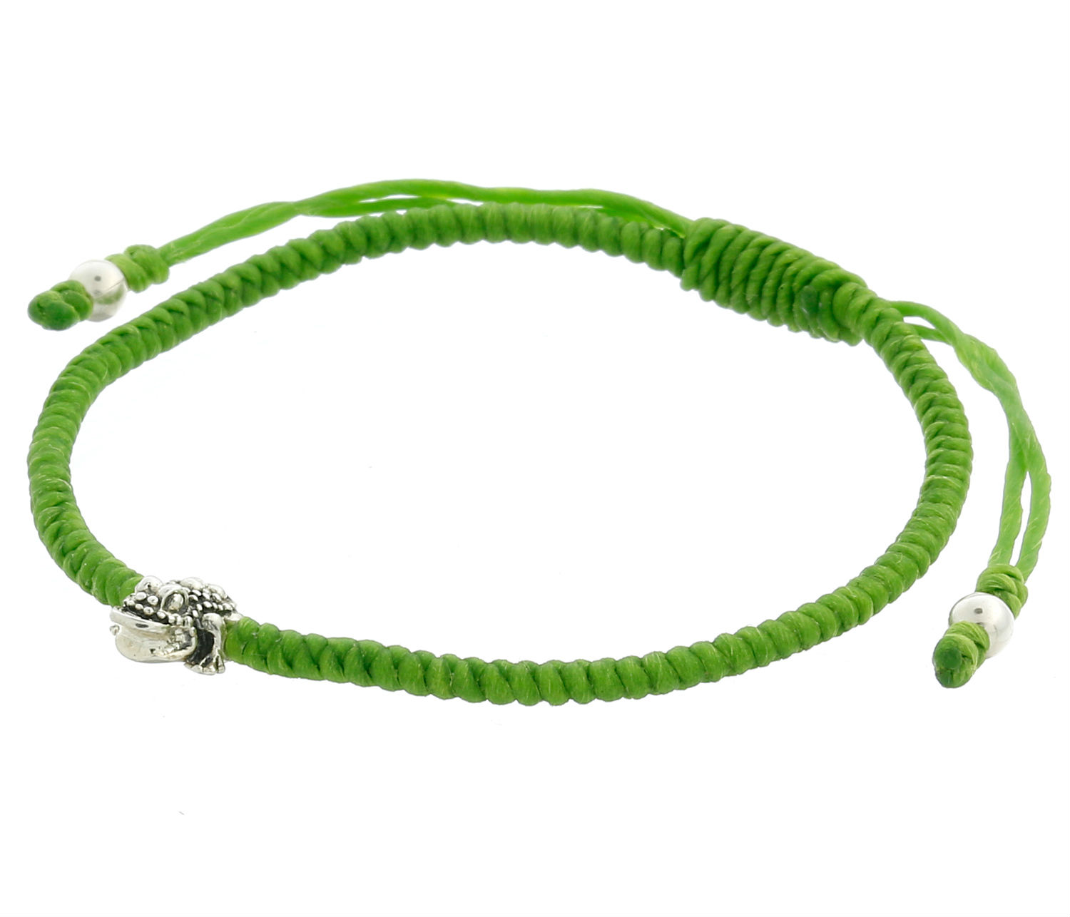 A sterling silver frog bead is inserted in a round, waxed cotton macrame bracelet. The frog resembles the Chinese money frog, "Jin Chan", a popular Feng Shui charm for prosperity.