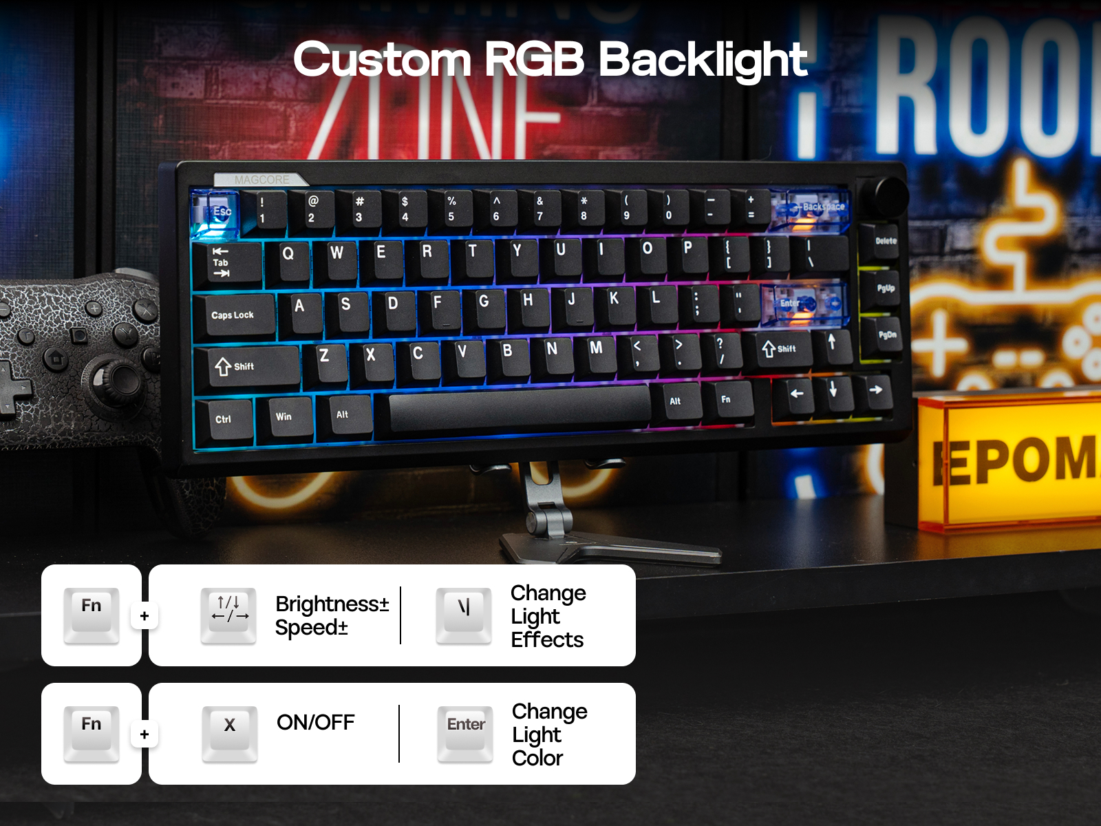 Shines as bright as your gaming skills, the Magcore65 Lite Gaming keyboard features 66 south-facing LEDs, for customizable RGB backlight.