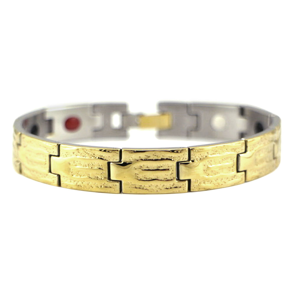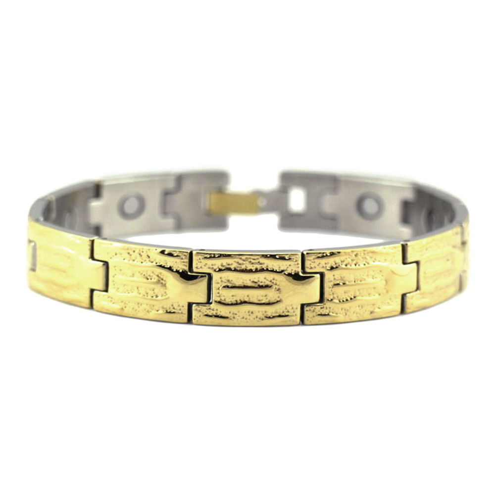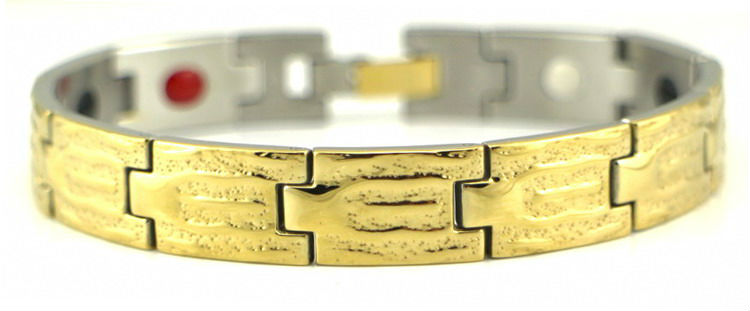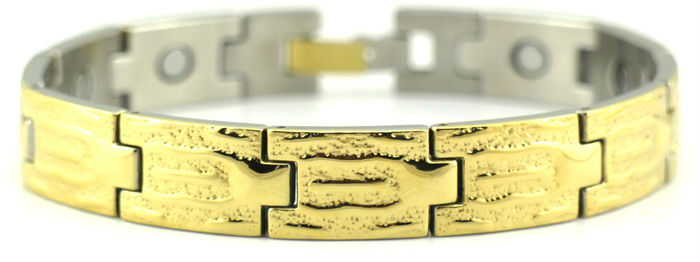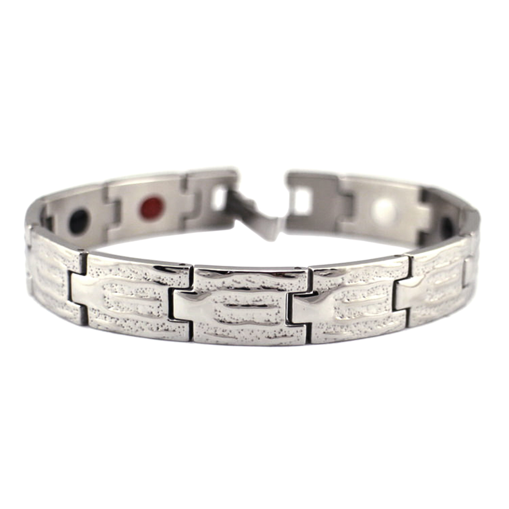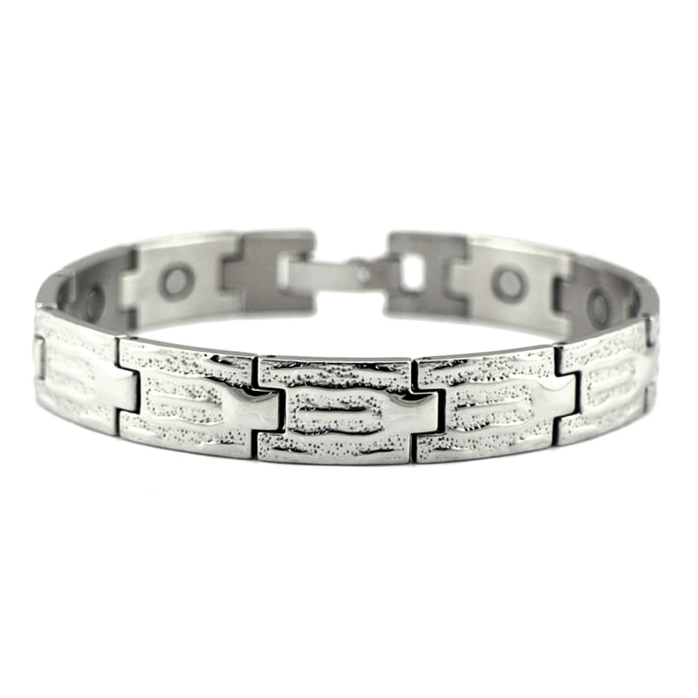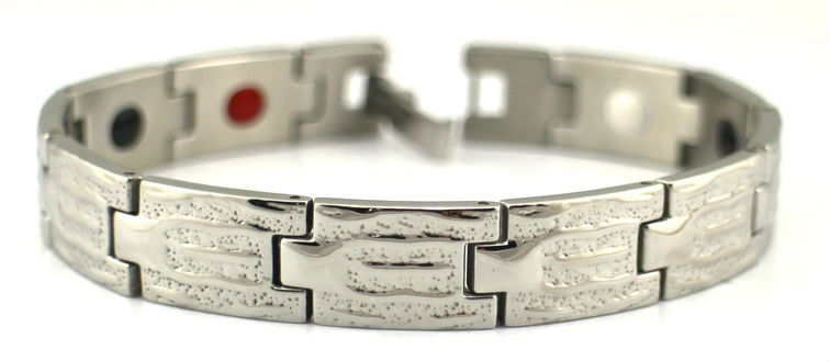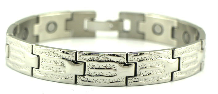 Showcased here is a magnetic bracelet made of high-quality stainless steel. It flaunts a distinctively textured outer with multiple magnetic pieces set underlay for effective magnetic coverage and therapy. Fastened with fold-over clasp, this bracelet can be put on and off quickly.