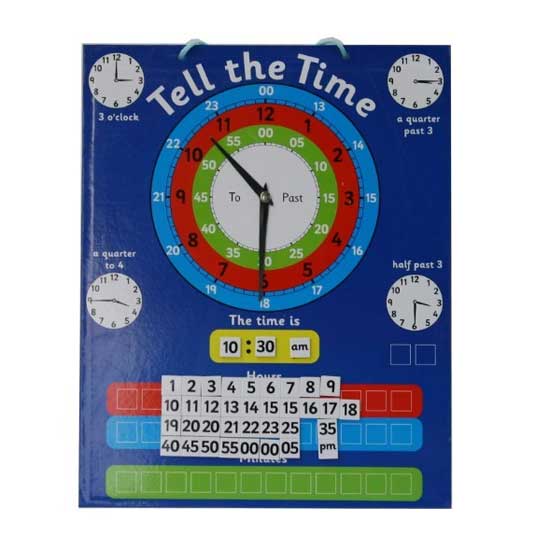 Displayed here is an educational toy that is designed for children to learn to tell time. Children are required to place the magnetic stickers to the blank spaces to tell the showcased time. It is also designed with magnets for easy holding.