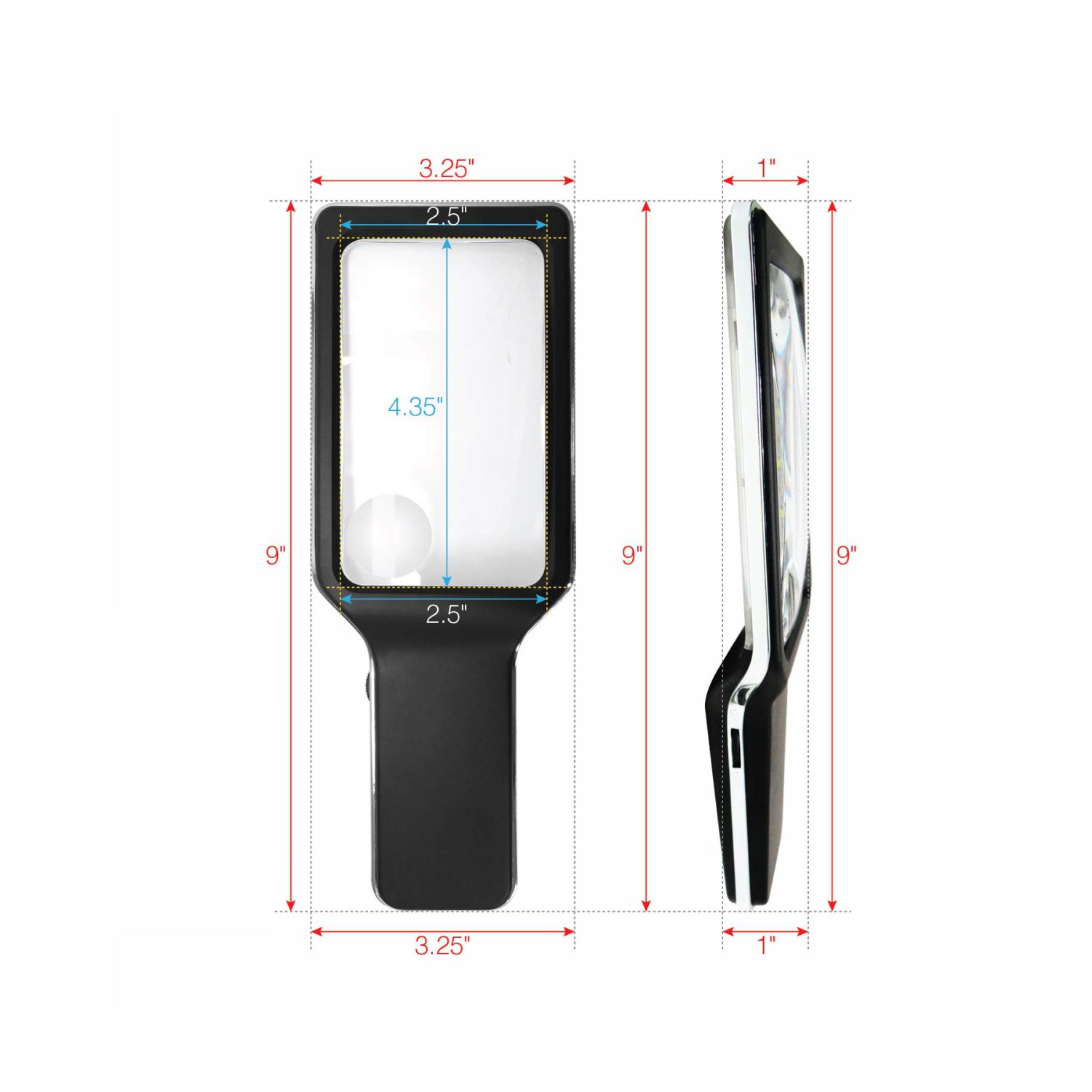 RECTANGULAR SHAPES THE WAY YOU NATURALLY READ: The rectangular lens is especially design to simulate the way we naturally view things from left to right, the magnifying lens covers large viewing area without having your hands move all the time, lens is measured 4.35"x 2.7" and magnifies up to 300%.