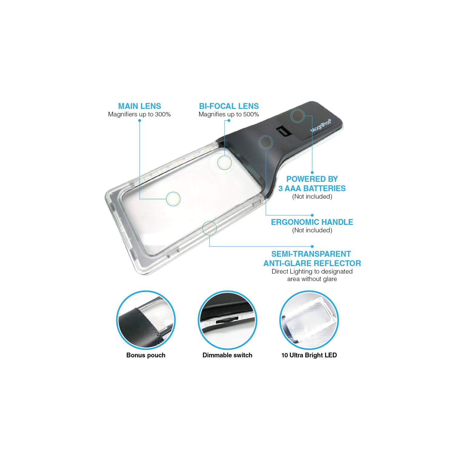 REDUCE EYE STRAIN & DIMMABLE LIGHTING : This led magnifier is clinically proven to be ideal for anyone who strains their eyes to see words on a page because it magnifies and provides light without glare. The roller dimmer allows you to easily adjust the brightness level(peaks at 600 lumens) with the tap of a finger to achieve the perfect lighting for various tasks.