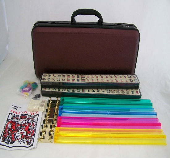 4 solid colored plastic racks with money holders, 166 thick plastic tiles (your choice of white, ivory colored, blue backed or burgundy backed,etc.), tile trays, chips, dice, Mahjong wind indicator, bettor & instruction booklet.