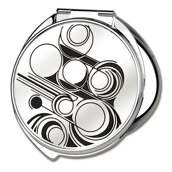 Boasting abstract circle and line patterns, this makeup mirror showcases a round profile of high-polish nickel plating for effortless hold in palm. Its foldable design further details a magnifying mirror and a normal mirror to ease on the go makeup touch-up.