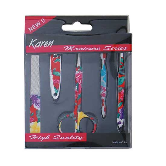 As shown is a ladies’ manicure set with beautiful flower patterns. Included is a nail file, a nail cutter, scissors, mini pliers and a mini brush. The unique manicure set here makes a caring gift for ladies.