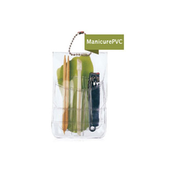 This is a manicure set with assorted pieces in a transparent bag. It comes with a metal chain for easy attachment. The compact size allows users to carry it with them on the go.
