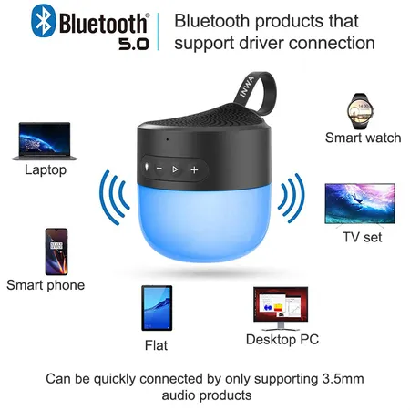 Support hands-free call, Blue tooth playback,AUX playback, play/pause, answe the phone, volume +/-, previous/Next song, support LINE IN, natural light + ambient light: white, red, yellow, blue, green, light color changes with music, hook design, compact and portable, ultra-long battery life.