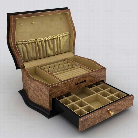 This luxurious jewelry box features a fish-tank shape. Made of maple wood, the box is characterized by the natural wood pattern of maple, making it more charming. With the piano finish, the box looks gorgeous. Given numerous slots and a slotted drawer, the jewelry box can contain various types of jewelries. Keep your jewelry in this splendid box.