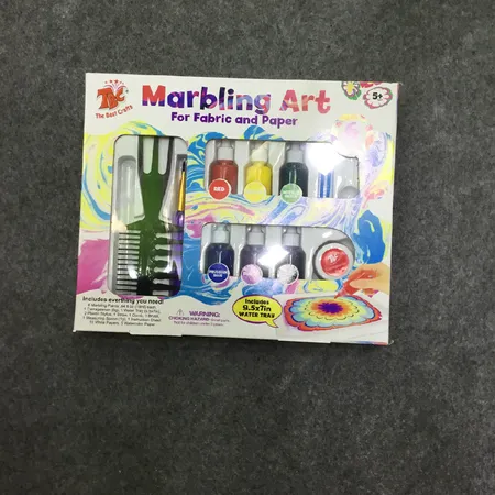 6 marbling paint, 1 carrageenan, 1 water tray, 2 plastic sticks, 1 straw, 1 drawing comb, 1 brush, 1 spoon, 1 instruction, 10 pages of paper, 5 professional paper in window box.