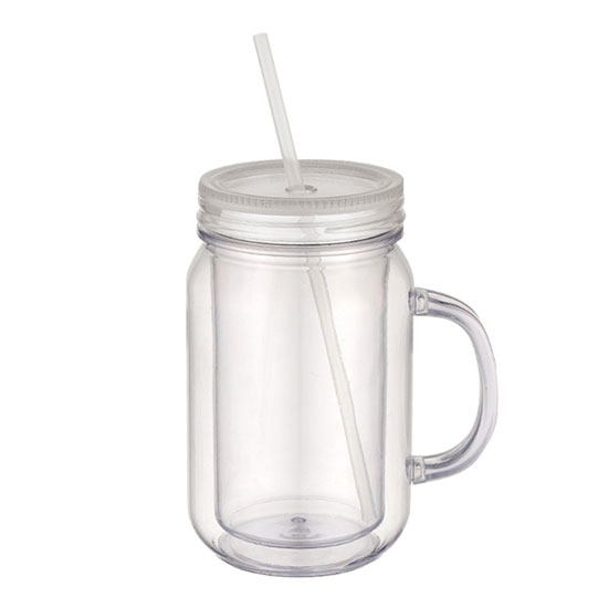 Featured is a double-walled Mason jar that comes with a handle. The lid features a small hole for inserting straws and serving drinks. Made of BPA free materials, this jar is exceptionally safe to use.