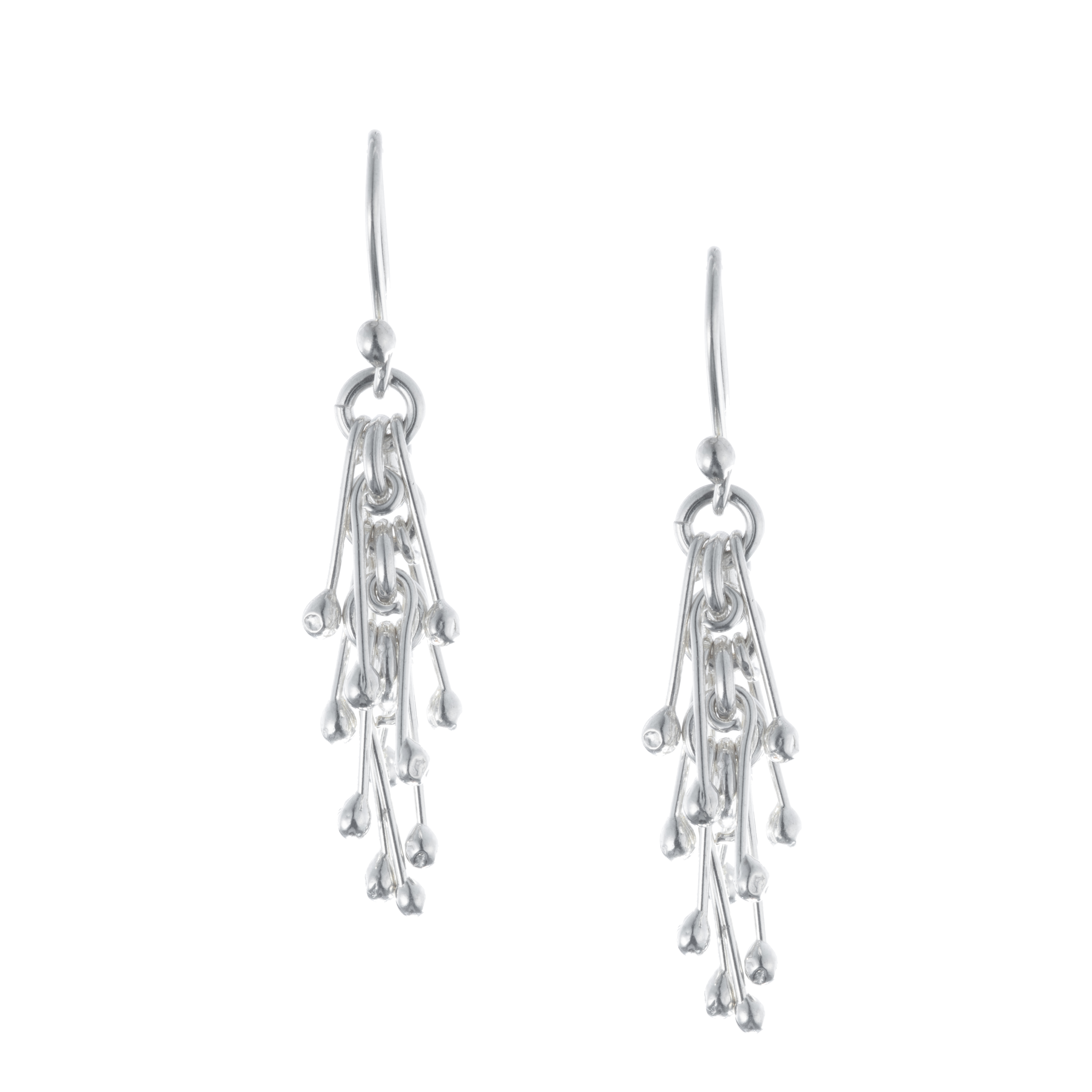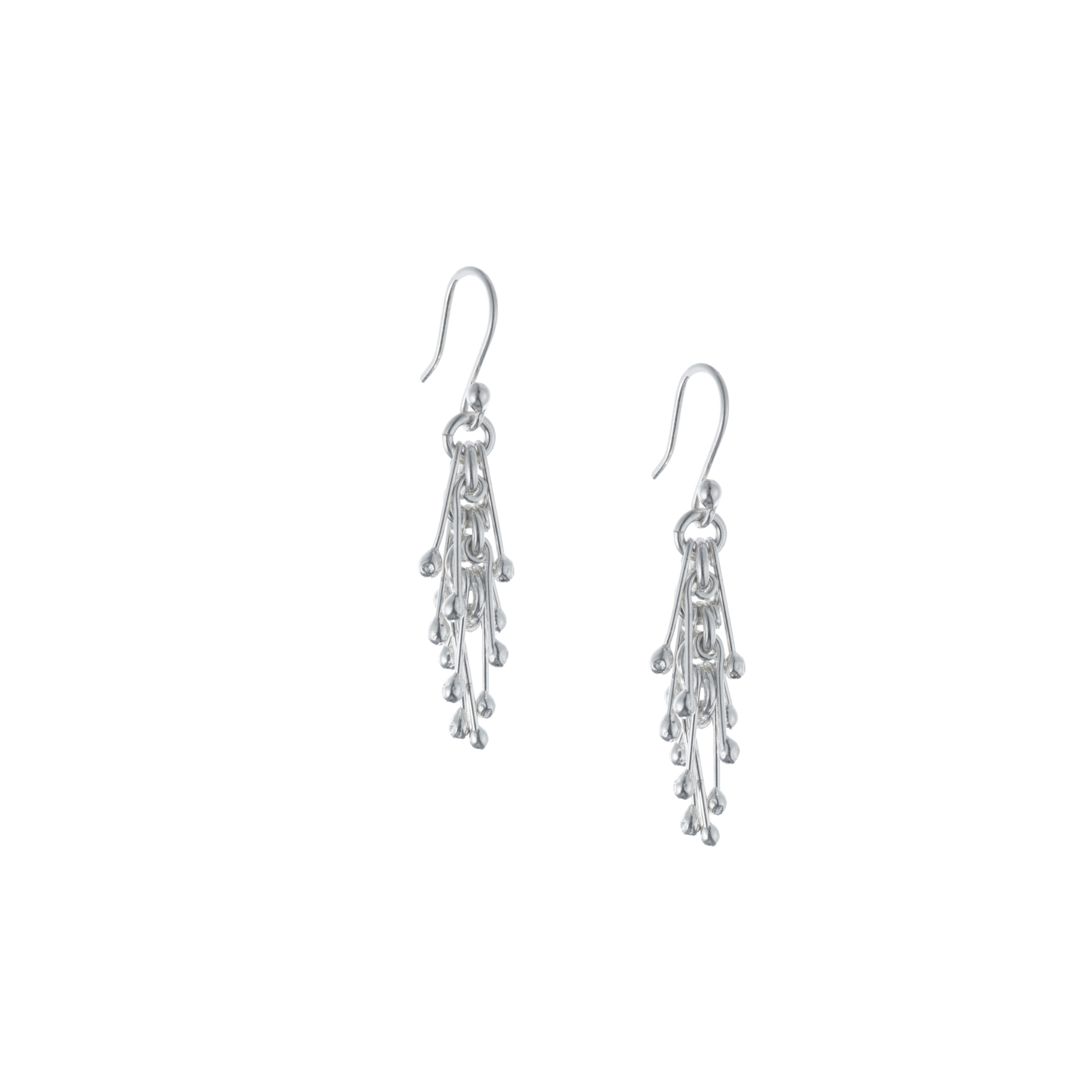 This set of necklace, earrings, and bracelet in silver stands out for its contemporary design with organic inspiration, where delicate rods topped with small spheres intertwine subtly, creating a dynamic and light silhouette. Each element seems to expand naturally, evoking flashes of light and movement, like a constellation delicately suspended on the skin. The necklace embraces the neck with a modern and sophisticated presence, combining harmony and character in a composition that is elegant without losing freshness. The earrings replicate this aesthetic with a stylized drop that elongates the face and adds a avant-garde touch. The bracelet, in turn, wraps the wrist with the same fluid rhythm, completing the set with coherence and distinction. The clasp, carefully integrated into the design, maintains the refined line of the piece: discreet yet secure, providing safety and functionality without interrupting the clean and futuristic aesthetic of the set.