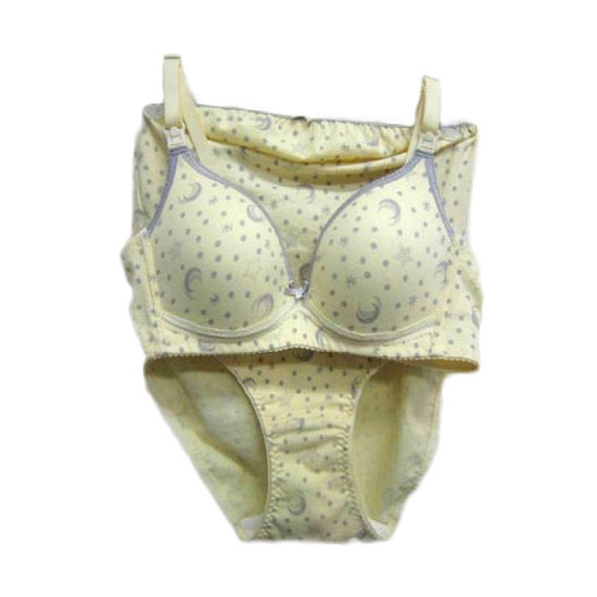 This is a pair of maternity nursing underwear in light yellow with cute prints in light blue. The bra is made of 100% cotton with adjustable straps. It is also designed with a free extra-extendable fastener to offer you more options to accommodate normal bust size fluctuations.